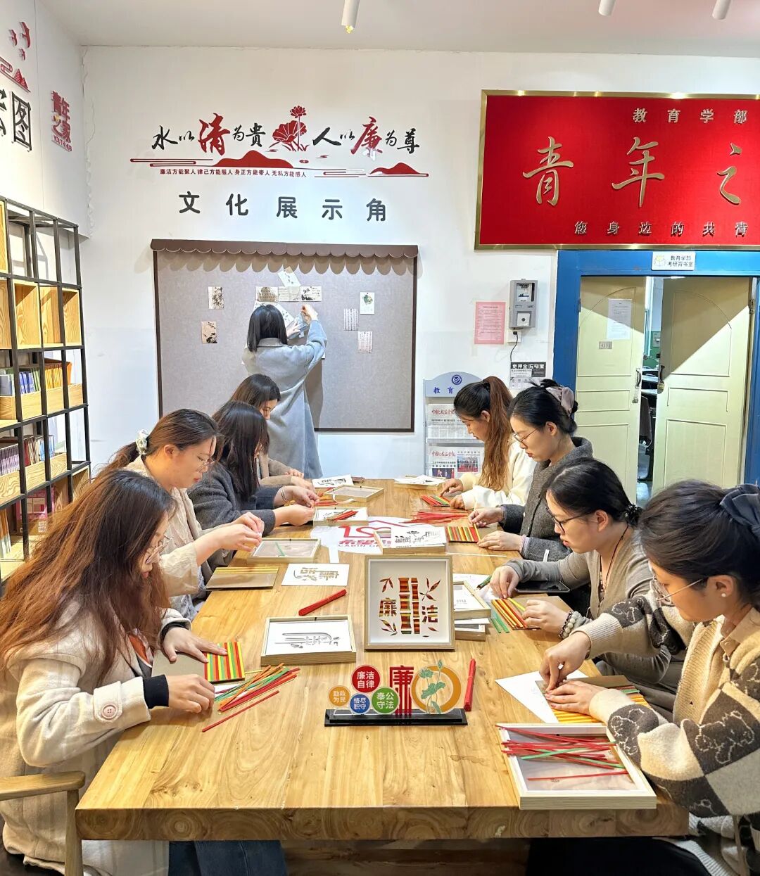 本次教育活动以体验非遗竹编画为载体,在一编一织中,传承千年匠心的坚守,在一压一挑中,蕴含清廉正直的风骨。活动中,毕业生党员们通过“一压一挑”的基础技法,让根根竹篾在指尖交错成型,大家将“廉洁”字样嵌入编织作品,精心装裱成画。经纬交错间,不仅锻炼了耐心与专注,更深化了对“竹以直而美,人以廉而尊”的切身体悟。