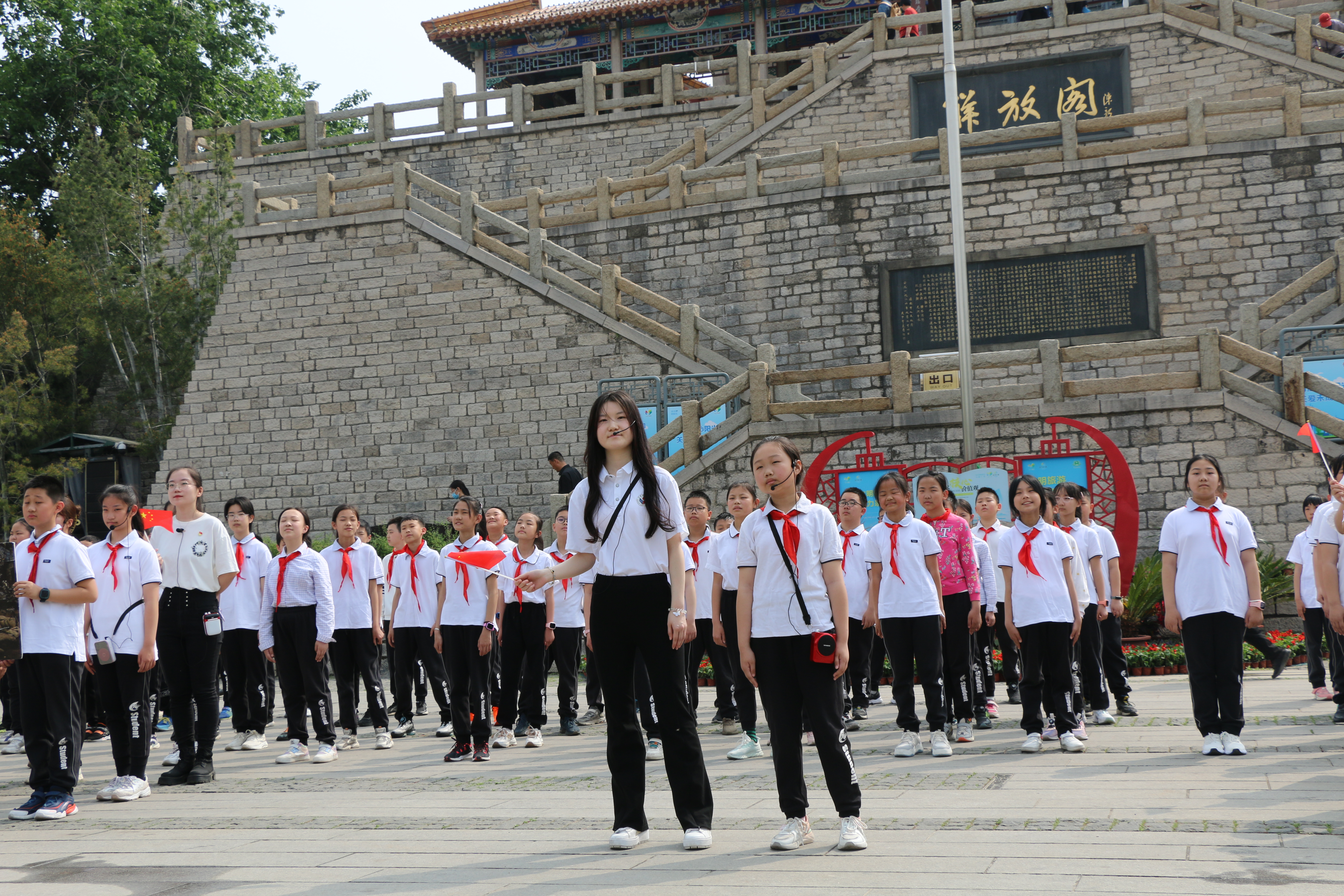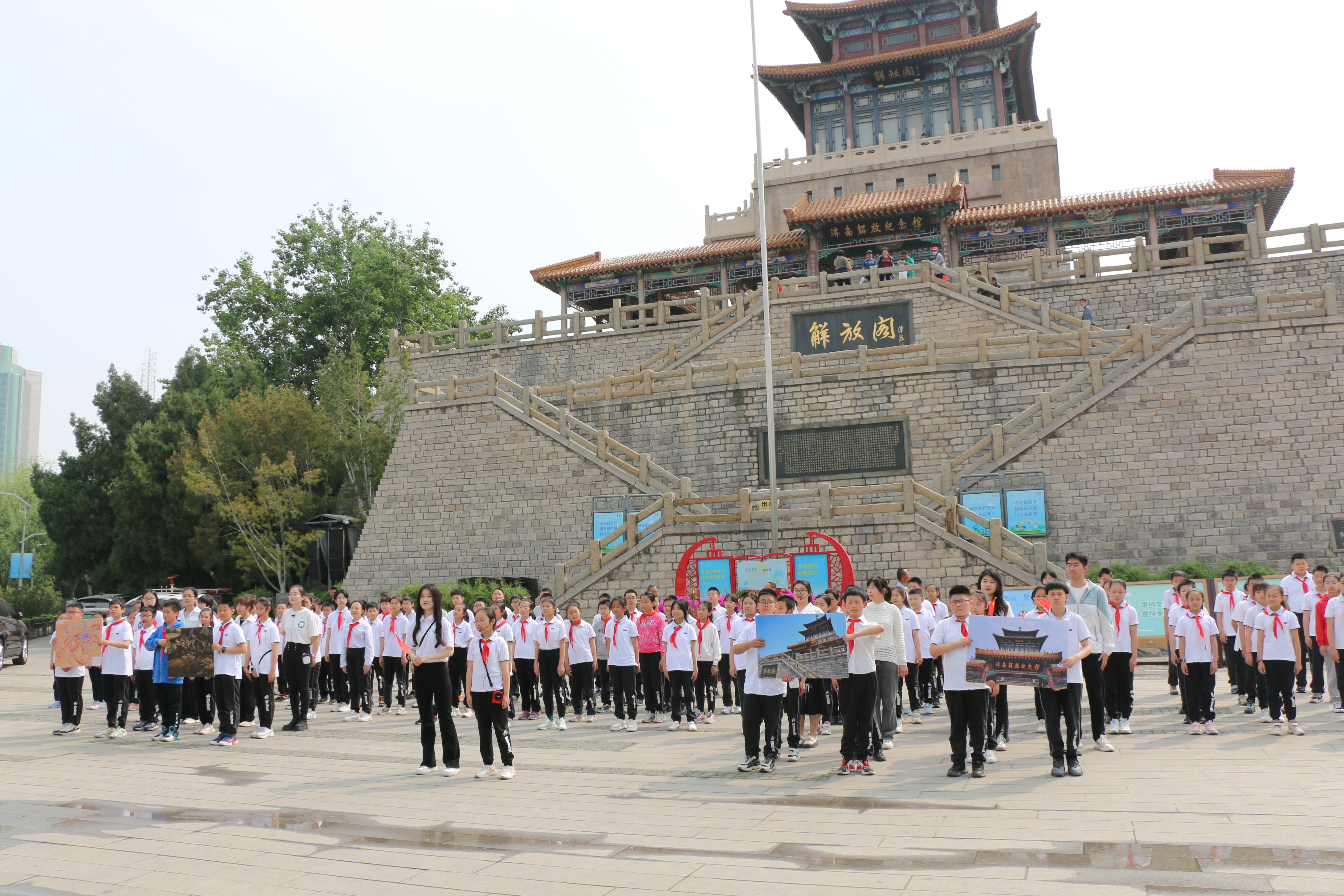活动伊始,英国上市公司365领导在济南市花园小学党总支书记、校长于晶的带领下沿护城河畔来到解放阁前,参观学校红色研学点。济南市花园小学少先队员代表为各位领导敬献红领巾。