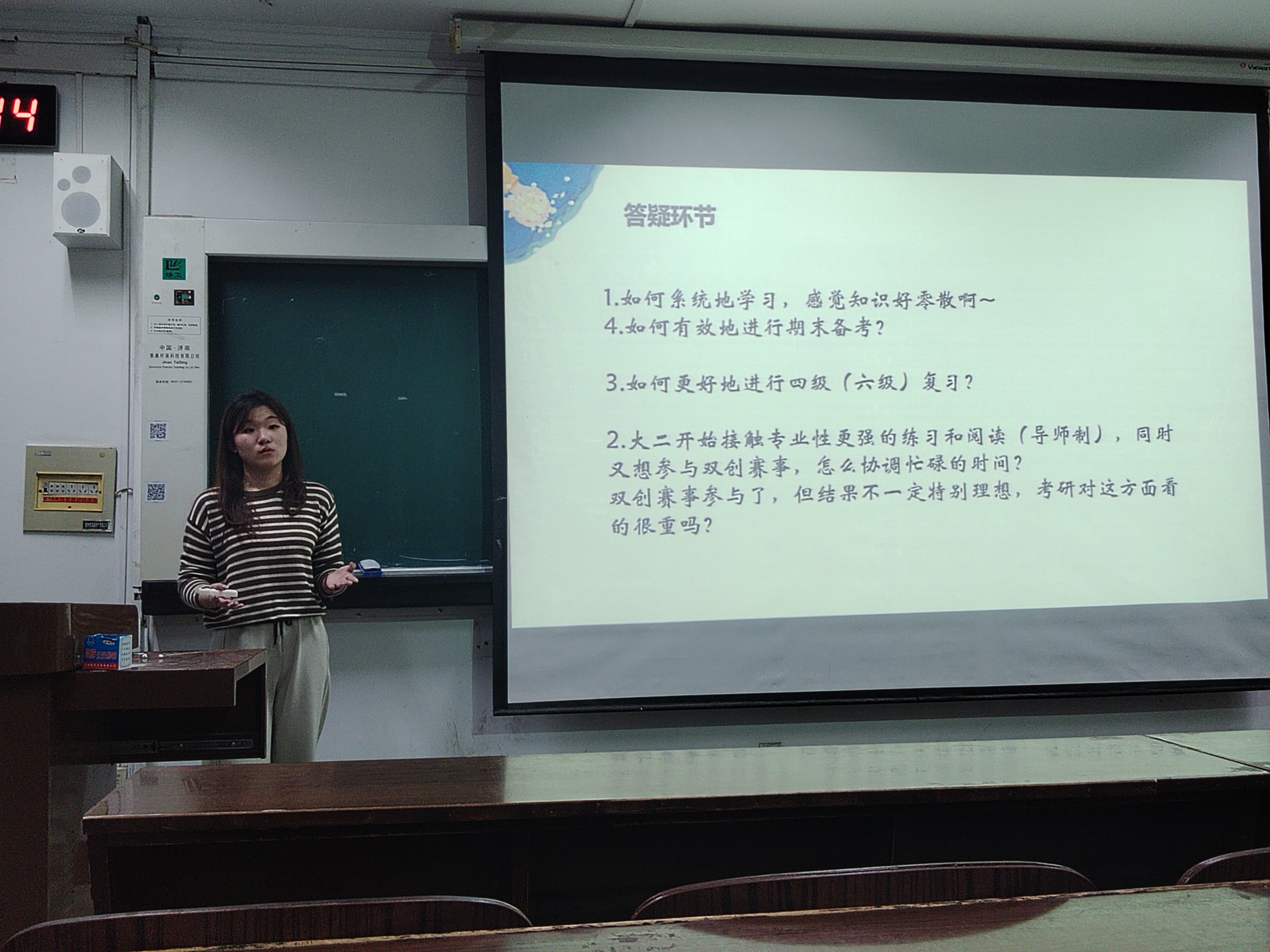 在分享会的最后,陶坤林师姐就同学们所提出的问题进行了细致解答,帮助同学们更好的复习备战期末与四六级考试,了解大学各阶段的主要任务,同学们认真听讲并记录笔记。