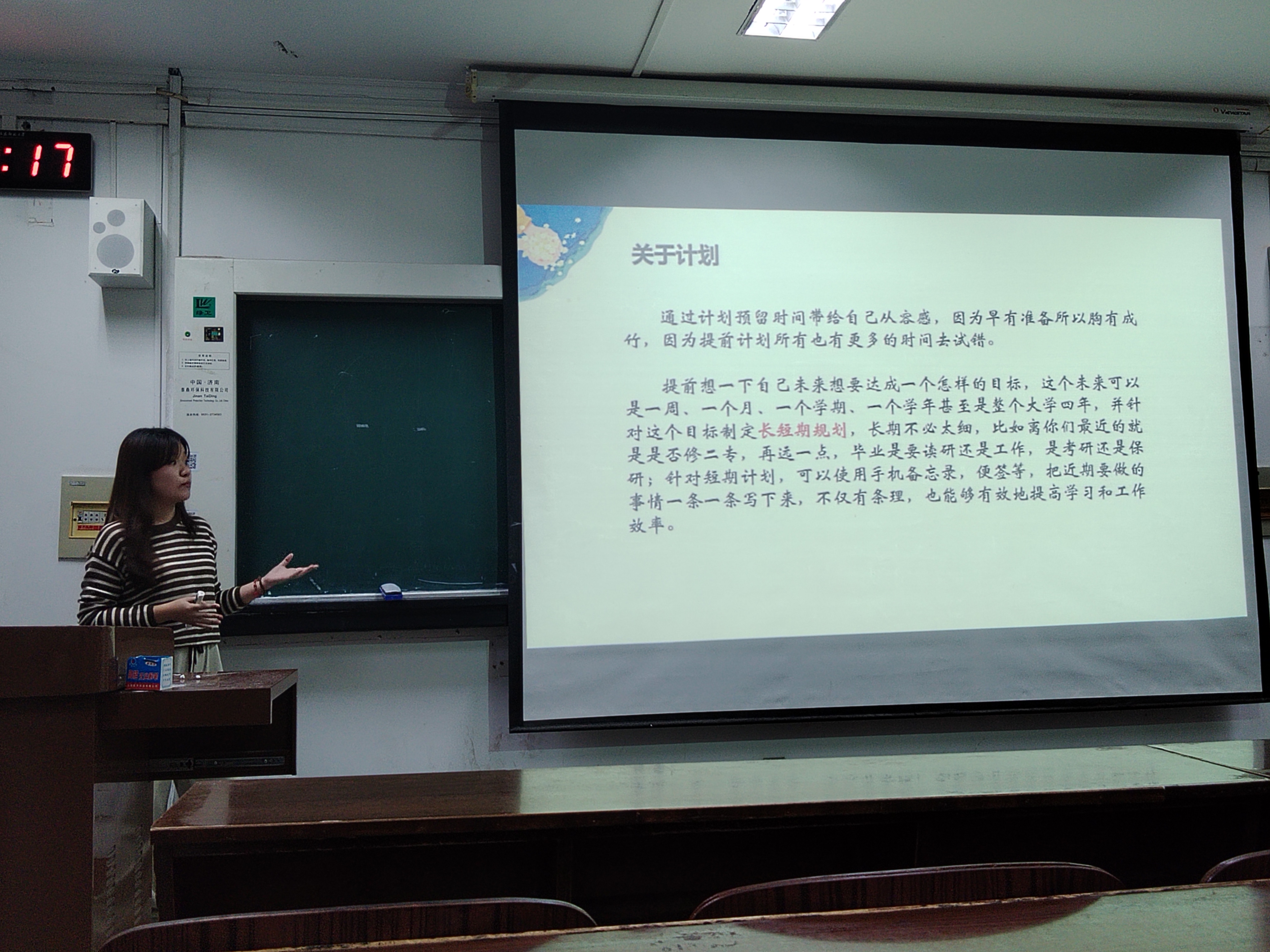 在本次分享会上,陶坤林师姐以祛魅为出发点,从什么是祛魅,为什么要祛魅,怎么祛魅以及问题与目标四个方面进行详细介绍。师姐以自己为例,为大家展示了大学生活的丰富多彩,她还介绍到成功的背后都有其更加真实,平凡的一面,要透过表面看本质。对于“为什么要祛魅”这一问题,陶坤林师姐认为每个人都是世界上独一无二的个体,每个人都有自己的花路。在担任职务后对自己应如何做要有清醒的认知,没有人的计划是完美无缺的,要在过程中不断改进,学会接受真实的自己,与自己竞争,接受自己的不完美,从依赖走向独立,争做一个能够独立思考,自主选择并勇于承担责任的人。面对如何祛魅的问题,师姐分为了七个方面,为自己的大学生活做好规划,高效地完成每一项任务,明白自己想要成为什么样的人;合理的规划时间,及时寻找老师和学姐的帮助;制定长短期的计划,提高学习和工作效率;把握好课前课中课后,认真对待每一门考试;敢于尝试新事物,参加各种活动提升自我素养;及时止损,不断反思与复盘,寻找新的出路。面对同学们关于考研、竞赛、教资等问题的疑惑陶坤林师姐给出自己的见解与推荐,并真诚祝愿同学们能做到祛魅,找到属于自己的学习方式。