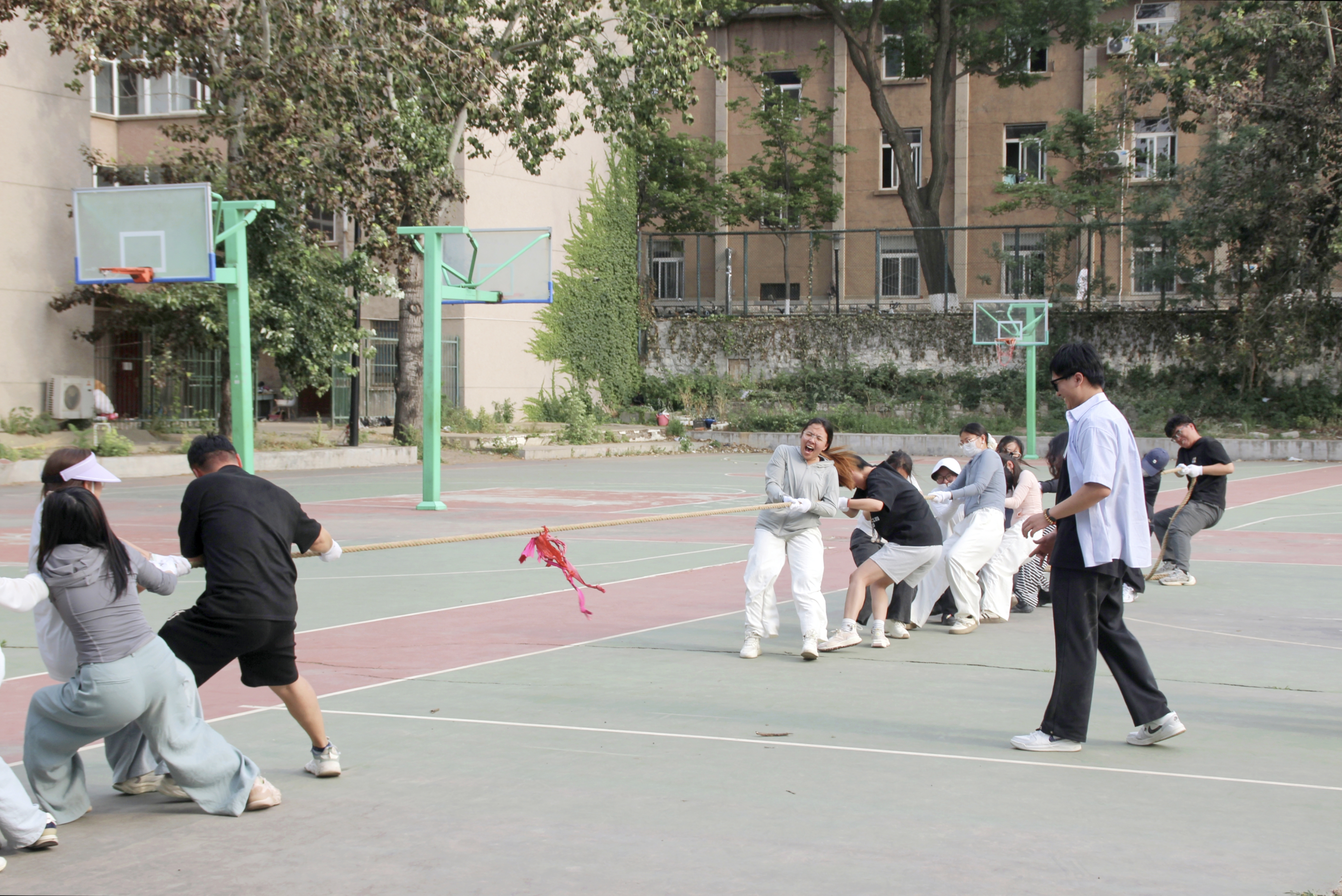 最后是火热的拔河比赛环节,12支参赛队伍抽签对决,采用晋级淘汰制一较高下。哨声一响,队员们立刻紧握长绳、重心下压,在整齐的“一二!一二!”号子声中展开力量与战术的比拼。场边拉拉队的呐喊声震耳欲聋,多场由逆转胜的精彩场面引爆全场欢呼,将赛事氛围推向高潮。