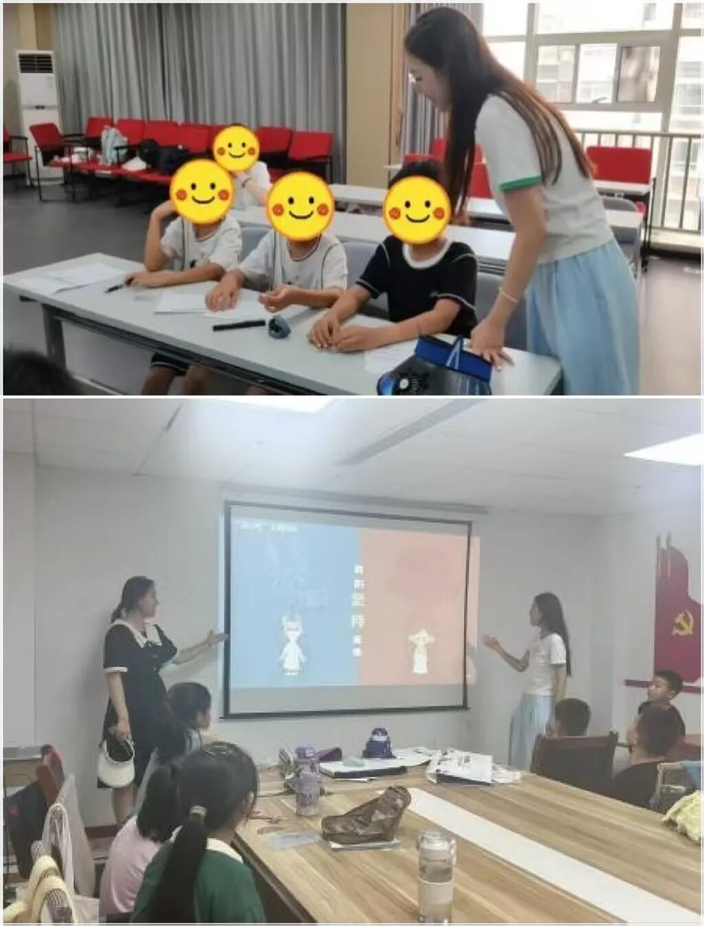 在凤凰社区,团队延续互动式教学风格,通过案例分享、故事讲述等形式,引导孩子们结合自身经历,分享对“坚持”的感悟。活动中,一名心理教师现场演示了“小物件疗法”——一种通过摆放象征性物件来投射并探索内心世界的专业心理治疗技术。通过与老师的交流,团队成员学习到了更多心理知识与辅导技巧。
