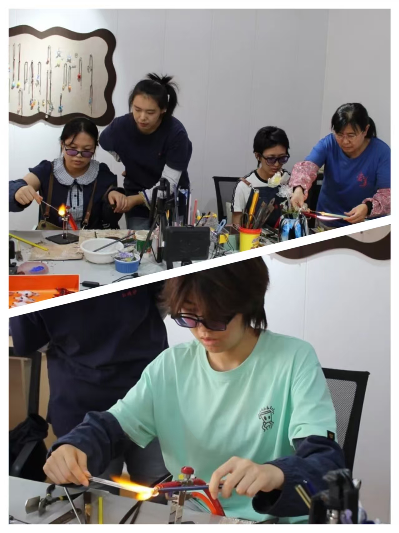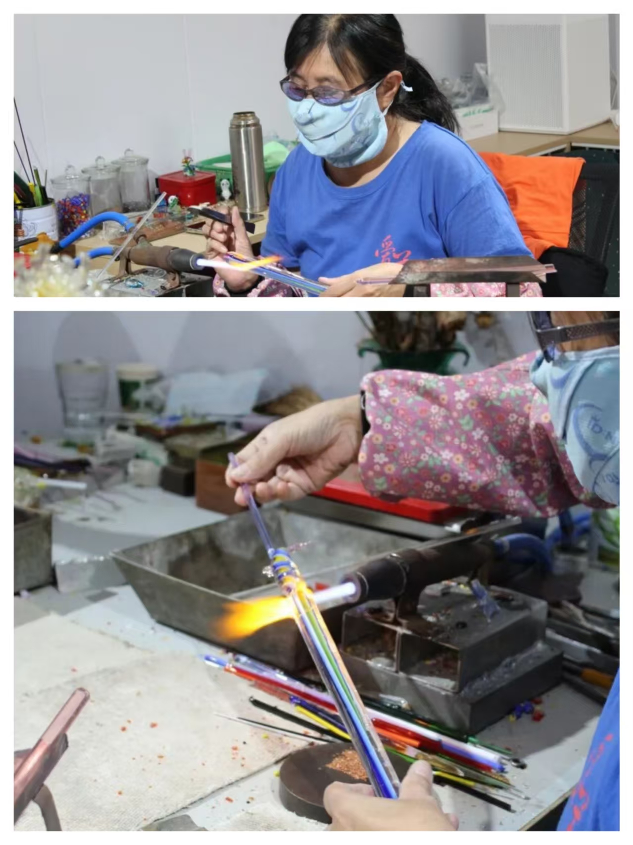 伊师傅的手上布满了长年累月制作琉璃时留下的伤痕,然而如今却依然坚守在传承一线。在交流中她提到,琉璃的学习时间长、制作技艺难度高,制作失败是“家常便饭”,因此愿意俯下身来钻研的年轻人越来越少。看到队员们积极尝试,她感到非常高兴,并希望有越来越多的年轻人了解琉璃、爱上琉璃。