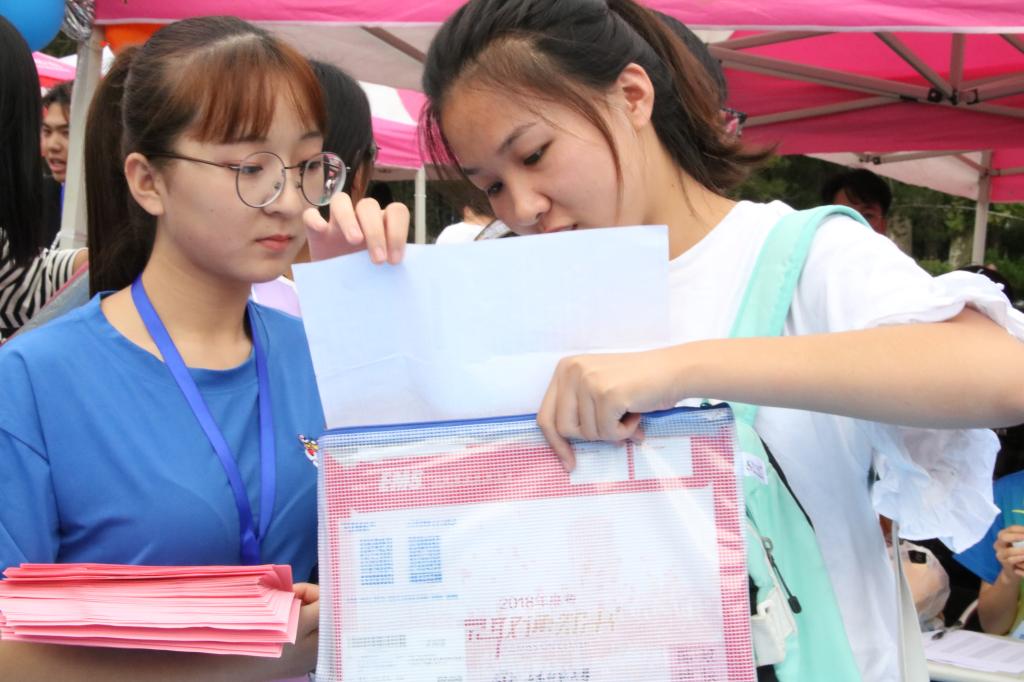 迎新工作分为“引导讲解”、“现场答疑”、“收发材料”、“宿舍指引”等多个服务环节,活动现场分工明确、高效有序。上午7点新生报到正式开始,邢瑜等负责“引导讲解”的同学,带领新生们到达指定的报到地点,并为新生详细讲解报到的流程。