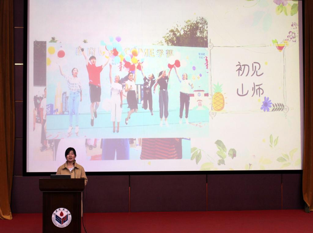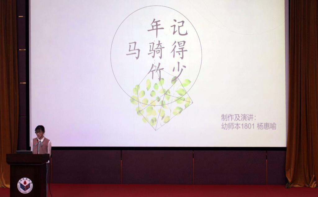 优秀学生代表演讲开始前,一段“2018级成长足迹”专题VCR揭开了此次分享交流活动的序幕。这段温馨精致的短片以时间为主线,串联起2018级新生入学半年以来参与的各项活动。迎新报到、新生军训、军歌比赛、秋季运动会……2018级新生由青涩到渐渐成熟的“时光旅程”中,点点滴滴都饱含着深深情谊。随后,12位学生代表依次走到台前,向大家分享了自己入学第一学期的生活与心得感悟。教育本1801班李翔以游玩攻略、美食探店和专业学习三个维度作为演讲的切入点,运用活泼的语言向观众介绍了自己简单又富有乐趣的日常生活。李翔建议同学们趁着春光大好,在保证安全的前提下多“出门走走”,在明媚的春日里出门游玩,既可以强健体魄,又能够陶冶放松身心。