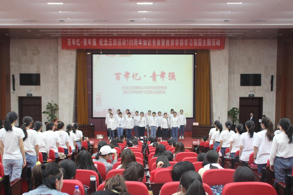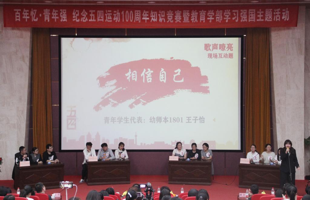 比赛开始前,五四历史与“教部学子有话说”融合的视频,将五四精神在当今教部学子身上的传承完美的展现出来。本次比赛共分为四个环节,前两环节为积分赛,后两环节为淘汰赛,以五四运动“爱国、进步、民主、科学”的精神内核串联全程。此外,本次比赛改变了传统知识竞赛的答题模式,除常规的选择问答题外,还有通过现场演奏猜经典歌曲、观看视频答热点话题等视觉与听觉相结合的方式的题目。各个环节之间穿插青年学生代表的风采展示,身姿曼妙的《红梅赞》舞蹈、激励人心的《少年中国说》朗诵、青春活力的《我们都是追梦人》歌曲等节目相继登场,赢得嘉宾观众的热烈掌声。在“科学,光华璀璨”的终极pk环节,本科生党支部代表队和电教本1801班团支部代表队的交锋格外精彩,获得了现场观众的阵阵喝彩。经过激烈的角逐,最终电教本1801团支部代表队获得冠军,本科生党支部代表队和幼师本1801团支部代表队分别获得亚军、季军。