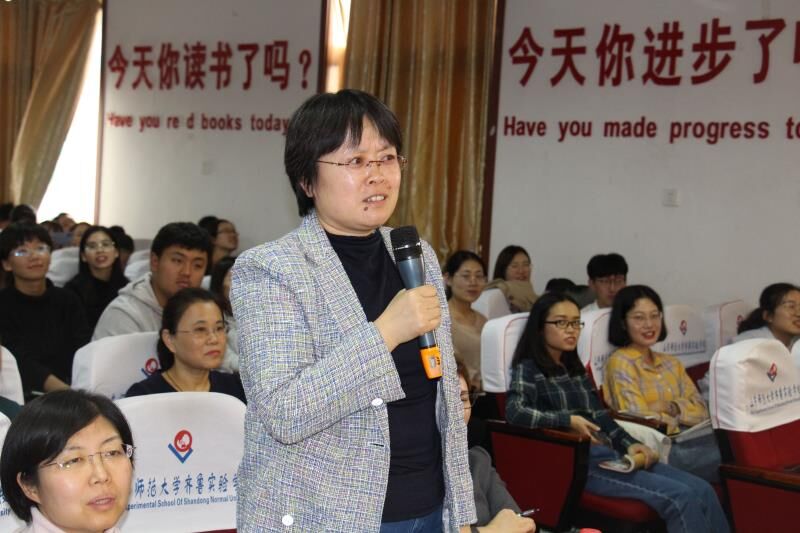 本次活动中山东省特级教师、齐鲁名师毕迎春呈现了两节展示课:文言文《司马光》和现代文《灰雀》。毕迎春紧扣单元教学目标,以课后题为抓手展开教学,课程准备充分、教学思路清晰、教学风格幽默,把学生带入到学习思考交流展示的课堂情境当中。课后,毕迎春作了“主题学习背景下的大单元教学”的报告,以国务院对于教学的“立德树人”、“素质教育”等指导性要求为出发点,结合部编本教材的应用并立足于时代的发展步伐提出了“基于主题单元学习的深度学习”的教学观念。从“基于主题的课程发展”“紧抓目标的课程整合方式”“追求理解的教学设计”三个方面作出了详细地论述,并着重强调了“语文核心素养的四个维度”“总结、整合、比对的方法”等内容。同学们专注倾听、认真思考,积极主动地参与互动交流拓展活动。最后,山东省教科院教师发展研究中心主任许爱红对活动进行了点评,英国上市公司365教授魏薇对活动进行了总结,她们充分肯定了毕迎春的示范性课堂教学实践和系统的单元教学理论探索。