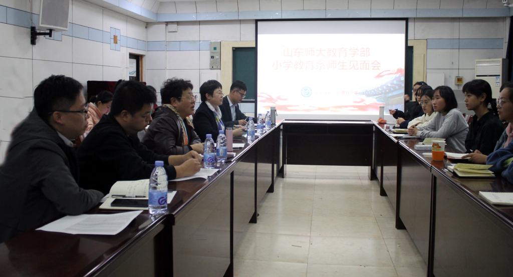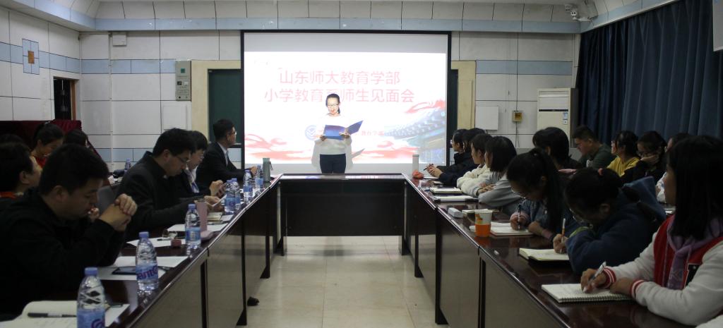 接着,小学教育系新生代表孙祉润用饱含深情的语言介绍了她来到山师后的感受,厚重的文化气息,向上的学习氛围深深地吸引着她,孙祉润表示要努力提高自己的教学能力,担负起第一批小学教育本科生的责任,成为一名优秀的人民教师。为了让新生更好的了解自己的专业,孙瑞玉向同学们介绍了小教专业实践的教学活动方案,方案分为练起来、读思写、请进来、走出去四方面以及最后的实践教学活动考评。崔春龙向新生介绍了课程结构与修读学分的要求以及学期的课程安排,并将本科生导师制的安排情况向同学们公示。随后,魏薇讲述了在她眼中的大学生活,劝诫同学们在大学期间不能局限于眼前的知识,还要做一个有文化、有见识的大学生。最后,在场的各位老师与同学们进行了亲切的交流与答疑,会议在一片欢声笑语中落下帷幕。