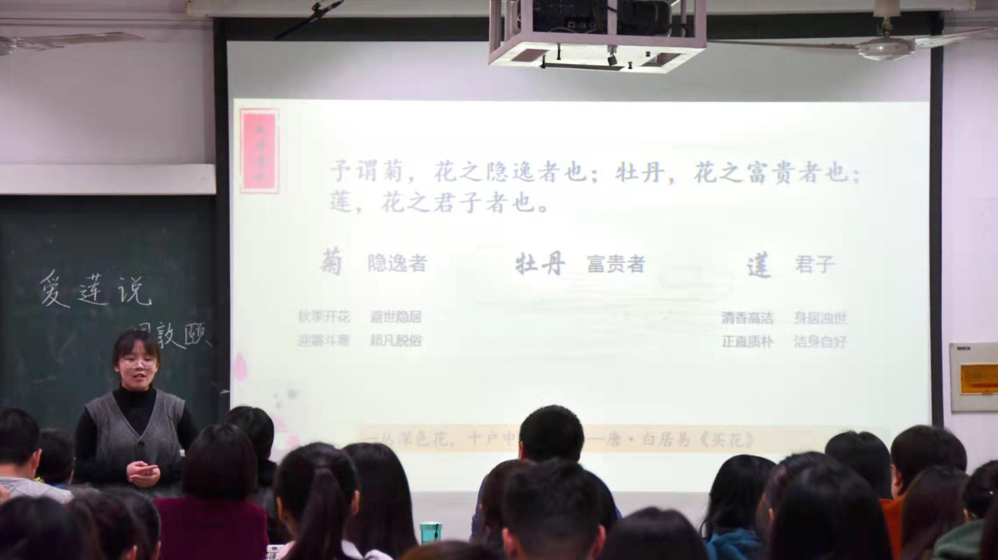 随后,各位选手按序依次出场,进行3分钟的模拟授课展示,授课分为语文、数学、英语和一专多能四类。走上讲台,选手们以积极饱满的精神状态,运用自己所掌握的教师技能,呈现了一堂又一堂精彩的模拟授课,展现了教部学子的出色风采。在展示语文模拟授课《爱莲说》时,选手们运用图片、名人名句等方式呈现了莲花“出淤泥而不染,濯清涟而不妖”的形态与气质,增添了课堂的趣味性。在进行数学模拟授课《两位数乘一位数》展示时,选手们选择了多种讲授方法,如摆小木棍、通过加法计算等,奇妙的课程构思充分展现出了教部学子对待教学的认真态度。
