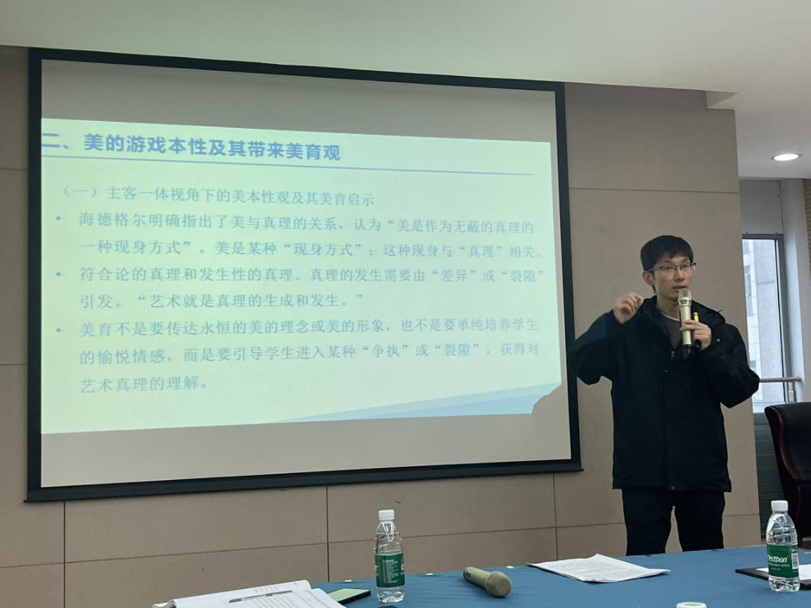 在“学校美育实践的哲学反思”分论坛上,张赛赛博士作了题为《美的游戏本性及其教学生成》的报告。在报告中,张赛赛认为对美的本性及其发生机制的理解构成了美育的思想前提,因此需要展开一种从“美的本性观”到“美育观”再到“美育方式”的融贯性研究。他首先分析了主客二分视角下的美本性观及其带来的美育难题,然后表明了一种主客一体视角下美的游戏本性及其带来美育观,最后探讨了美的教学生成问题。