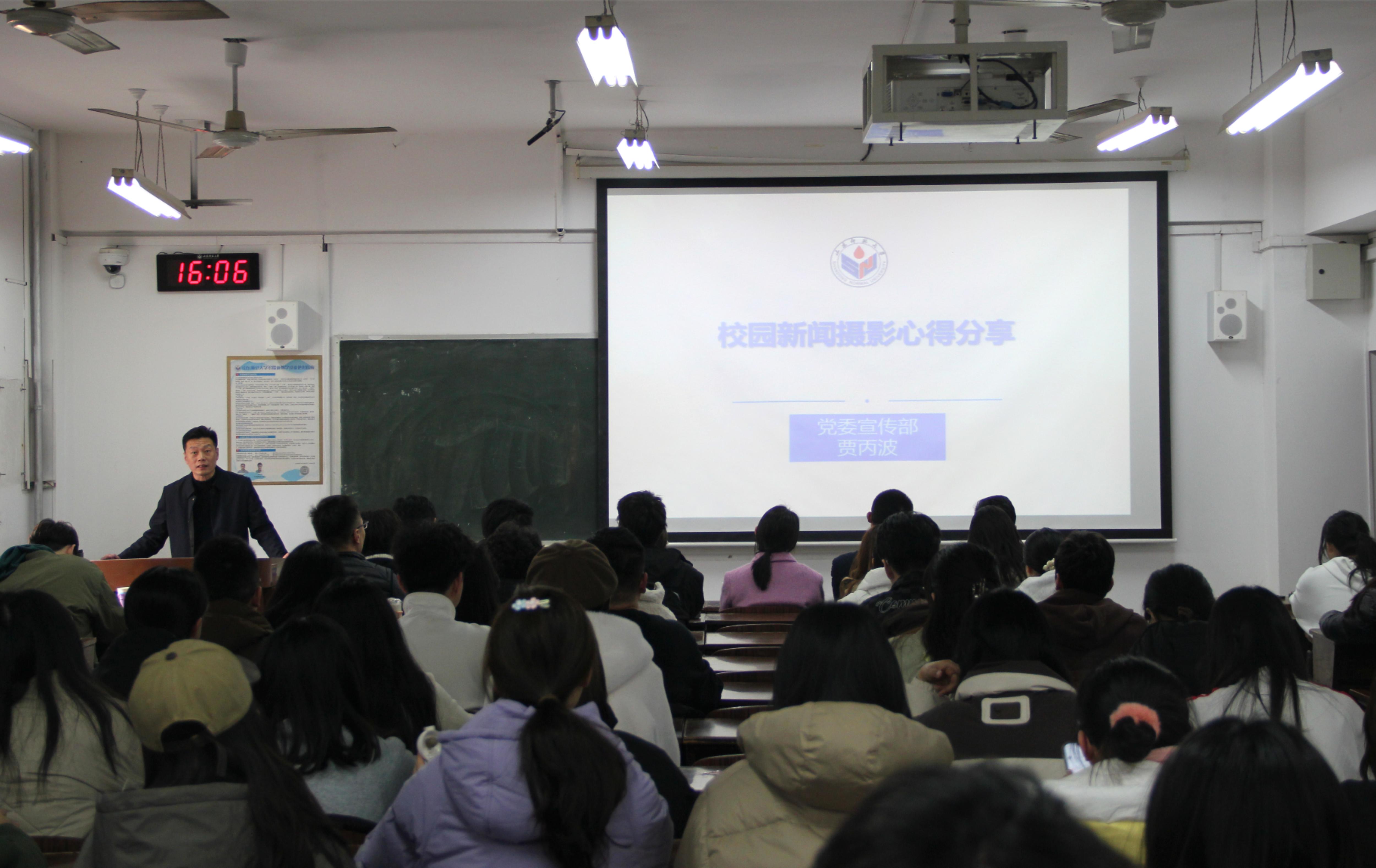 贾老师结合宣传工作实际以及自身经历,深入浅出地阐述了校园新闻摄影的内涵和价值,从构图技巧、光线运用、新闻敏感度等方面对新闻摄影进行了详细讲解。他认为校园新闻摄影不同于其他新闻摄影,需全方位凸显真实性、时效性、现场感这三个要素。贾老师通过展示往届校园活动摄影案例,对比分析了典型作品与常见问题:在真实性层面,他强调应避免过度摆拍或后期修饰,需以自然视角记录事件原貌;针对时效性,他以会议类、学术讲座等场景为例,提醒拍摄者需提前预判关键节点,确保素材能快速服务于新闻报道;谈及现场感塑造,他示范了如何通过抓拍人物表情、环境细节以及动态瞬间,增强画面的代入感和感染力。在培训尾声,他鼓励大家多拍多练,把所学技巧融入每一次创作,让知识在实践中落地生根,真正做到学以致用。