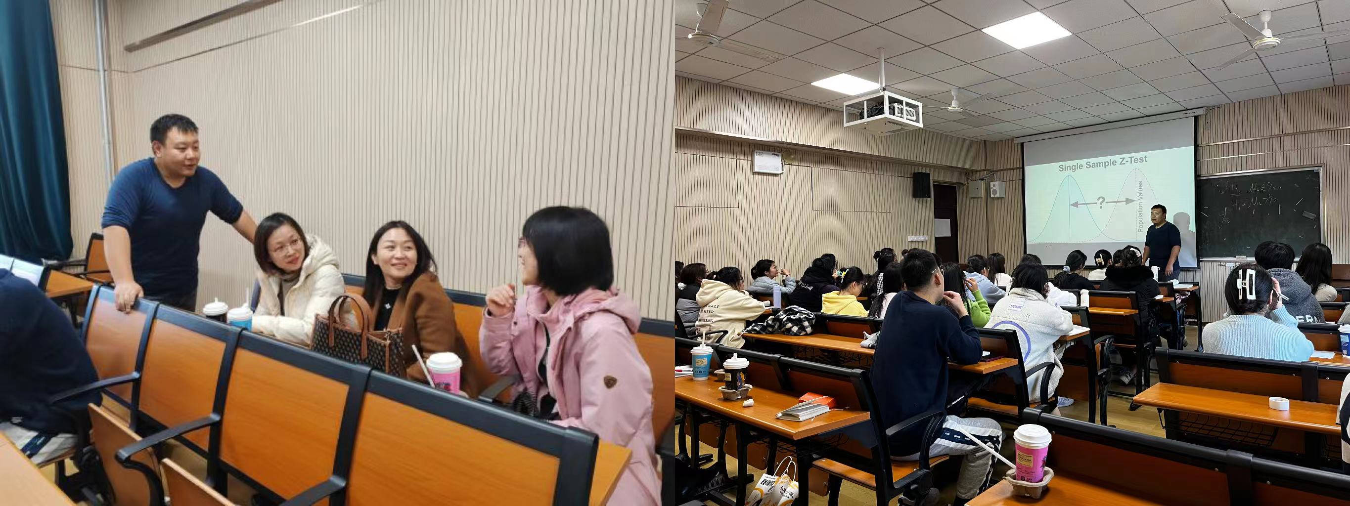 统计课程作为科学研究方法的基础课程之一,一直是人文社科类专业本科教学的难点。为了提高统计课程教学的效率,教育研究方法教研室的成员多次探讨课程开设与组织方式。2023年11月17日下午,教育科学研究方法教研室的张莉、乔资萍和王文老师在“教育统计与测量”课程中,旁听并点评了谭敏达老师关于“假设检验”章节的讲解。