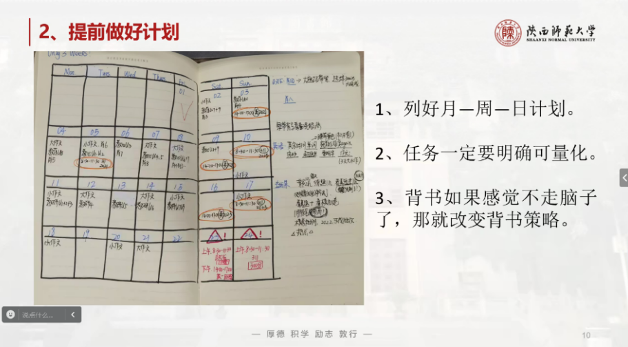 其次,根据调研结果显示,2021级同学的考研意向集中于选用311科目的院校和专业,因此教育学专业于2024年10月30日在腾讯会议举办“教育学考研311科目经验交流会”,邀请2020级有该科目备考经验的毕业生代表分享成功经验。会议由王文老师主持,2021级20余位同学参加。目前就读于华中师范大学的潘睿祺同学针对目前大四同学所处的考研冲刺阶段,着重介绍了个人初试成绩较高科目的备考经验,推荐了该阶段值得参考的书籍和资料。就读于陕西师范大学的陈昭宇同学介绍了自己去年该阶段的学习日程安排,并建议同学们按照“月—周—日”的思路做好冲刺阶段的复习计划,务必将学习任务明确量化。就读于北京师范大学的董可容同学不仅介绍了个人的相关经验,还热心收集了身边其他硕士同学的备考建议,围绕初试各个科目较为全面介绍了最后阶段的复习经验。除了具体的复习建议,三位同学也都鼓励大四同学注重身体健康,保持良好心态,坚持到底,切勿放弃。最后,毕业生代表回答了参会同学关于各科时间分配、复习资料选取等方面的问题。