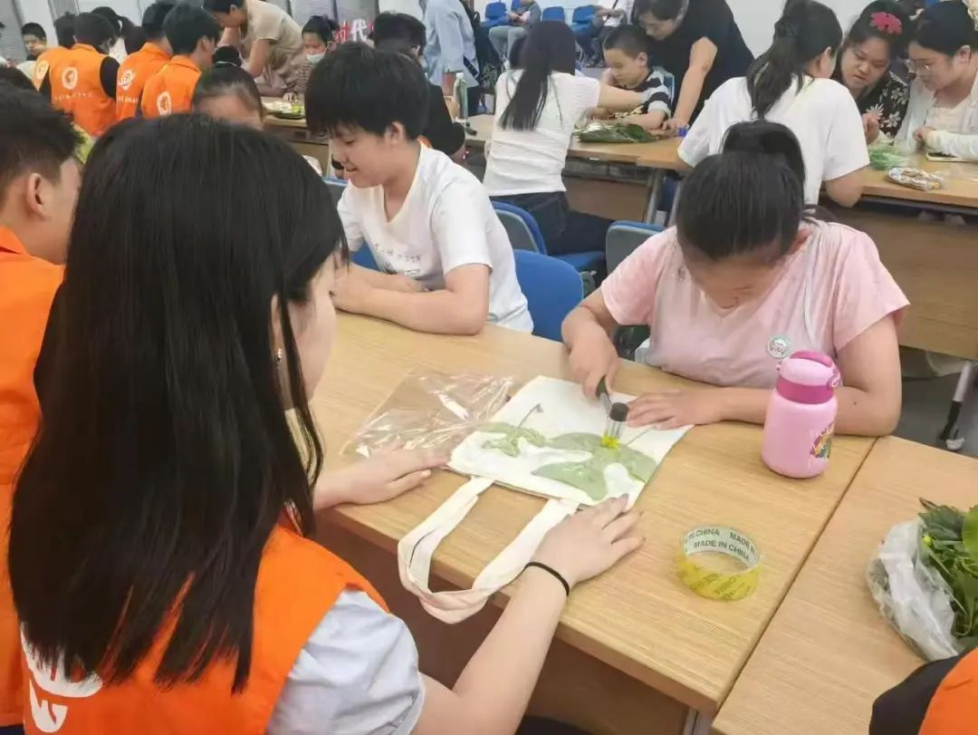 植物拓印环节,孩子们仔细挑选树叶与花瓣,在素色布袋上排列出心中的图案。锤子落下的声音清脆而宁静,仿佛每一击都是与自然的对话。有个女孩反复调整叶子的位置,专注得像一位小小的匠人。当她最终举起布袋,看到叶脉清晰浮现、色彩自然晕染时,脸上绽放出灿烂的笑容。