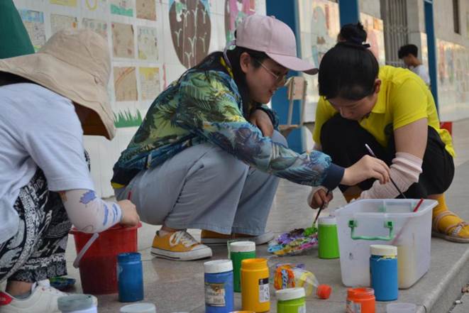 支教团成员除了在教室里留有身影,在走廊里也留下了彩色的印记。13日下午至14日,支教团成员进行了一天半的墙绘工作。烈日炎炎,支教团成员将去年和前年支教团绘制的墙绘进行“翻修”,同时,在教学楼二楼补画若干幅传统文化节日的墙绘。安静的教学楼走廊里留下了支教团成员认真绘制墙绘的身影。