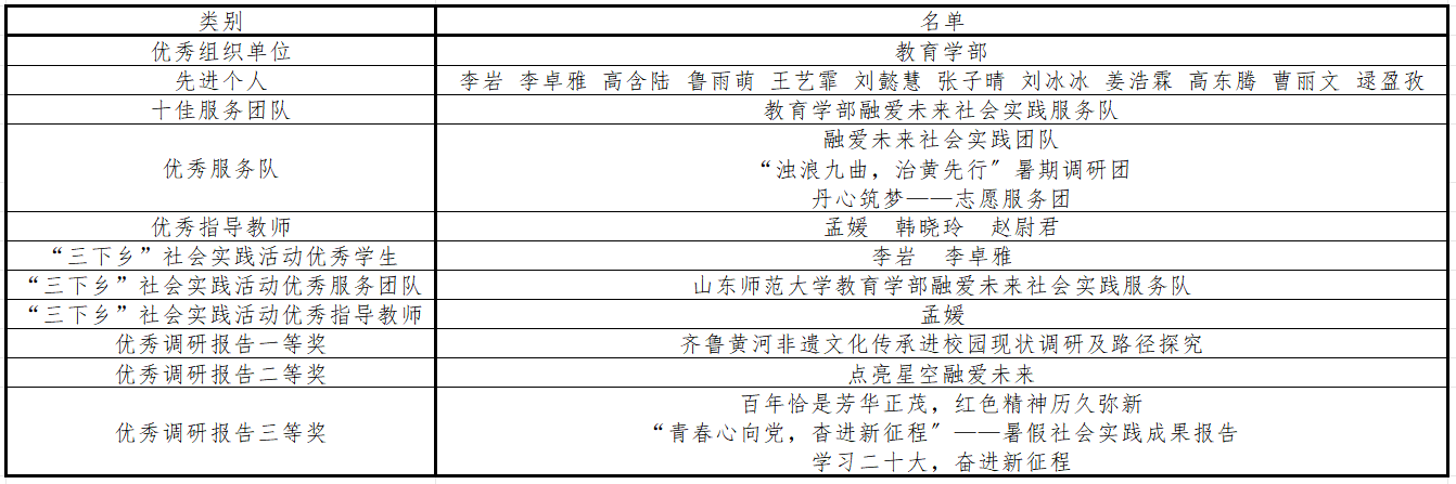 近日,英国365集团公司团委下发了《关于表彰2023年暑期大学生社会实践活动优秀组织单位、优秀指导教师、优秀服务队和先进个人的决定》。其中,英国上市公司365入选2023年暑期大学生社会实践活动优秀组织单位;英国上市公司365融爱未来社会实践服务队入选2023年暑期大学生社会实践活动十佳服务团队名单;孟媛、韩晓玲、赵尉君三位老师入选2023年暑期大学生社会实践活动优秀指导教师;融爱未来等3支队伍入选优秀服务队;《齐鲁黄河非遗文化传承进校园现状调研及路径探索》等5份调研报告入选2023年暑期大学生社会实践活动优秀调研报告名单;李岩等12名学生入选2023年暑期大学生社会实践活动先进个人。其中融爱未来社会实践服务队入选山东省暑期“三下乡”社会实践活动优秀服务团队,项目负责人李岩入选2023年山东省暑期“三下乡”社会实践活动优秀学生,指导教师孟媛入选2023年山东省暑期“三下乡”社会实践活动优秀指导教师。