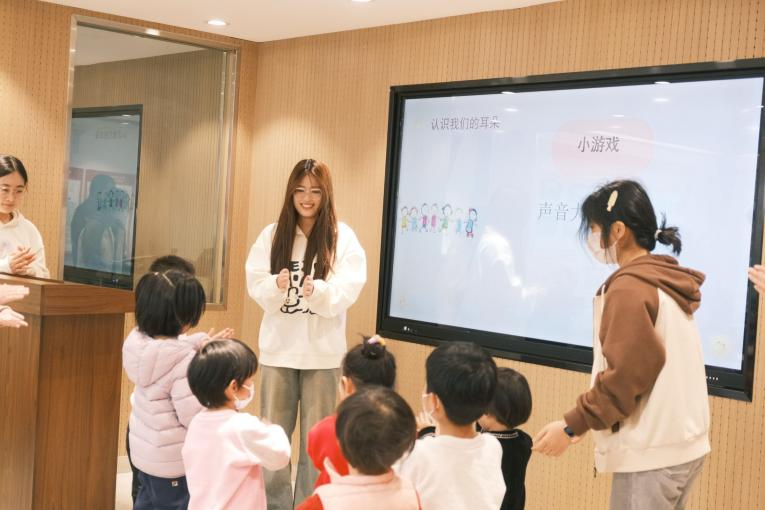 活动最后,是王晓辉、储佳琪、杨悦婕、徐婧、丁子涵五位同学的科普时间。杨悦婕和丁子涵同学首先用手鼓和小朋友们做了小游戏,重新调动了小朋友们的积极性,引入了“耳朵”这个话题。接下来,王晓辉同学从爱耳日的由来、认识我们的耳朵、伤害耳朵的行为、保护耳朵我知道,四个方面介绍耳朵的重要性和如何去保护耳朵。最后由徐婧同学教小朋友们学唱爱耳儿歌。小朋友们纷纷发言回答问题,积极参与到活动中来。