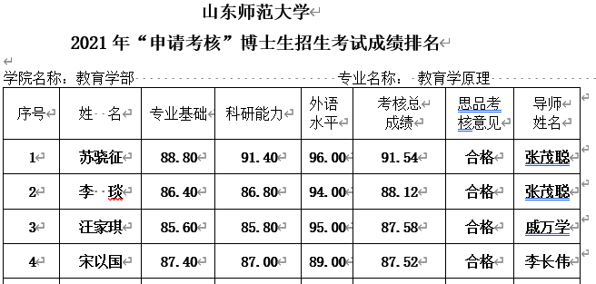 2021年“申请考核”博士生招生考试成绩排名(教育学原理)
