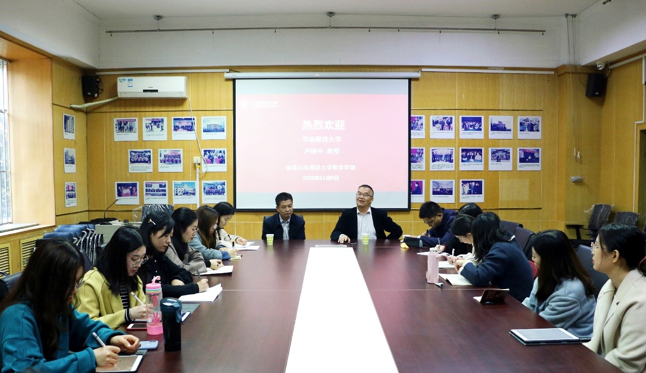 座谈伊始,卢教授首先向同学们介绍了华南师范大学教育学科的基本情况。他说,华南师范大学教育学科历史悠久、底蕴深厚,发展的过程中涌现了众多像朱勃先生、叶佩华先生等这样的教育大家,他们为教育学的发展做出了突出贡献。接着,卢教授向同学们分享了自己的独特履历。卢教授在受聘成为教授之后并没有停下学习的脚步,“教学研后知不足”,毅然决定攻读博士学位继续深造。卢教授孜孜不倦的求学精神深深触动了在场的每一位同学。