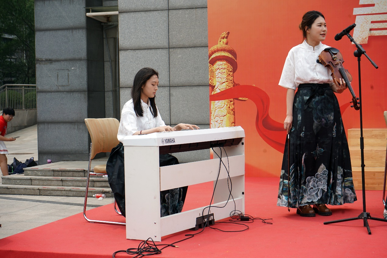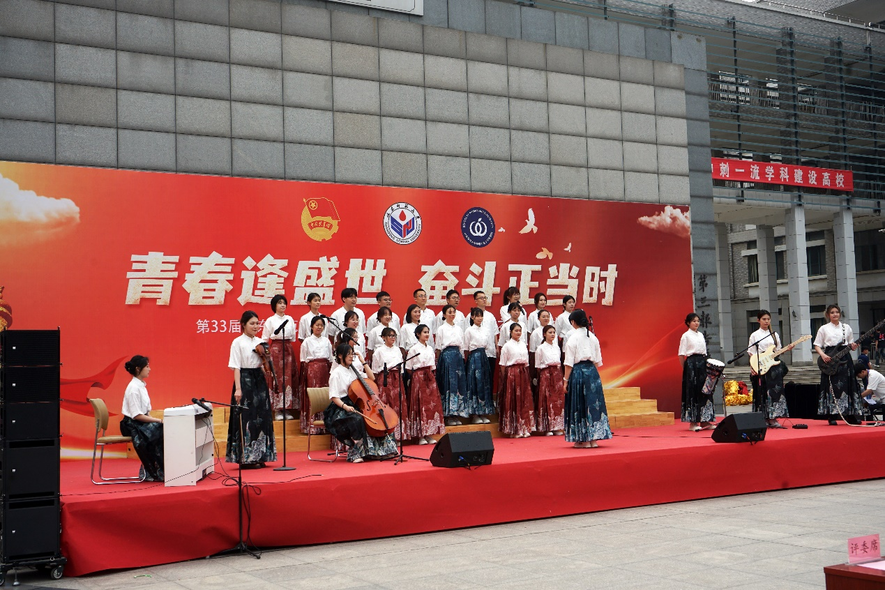 正式登台演出,舞台上的师生手拿小鼓,身着马面裙,随节奏摇摆,合唱声音铿锵嘹亮、动作整齐划一,乐器鼓弦相合、宛转悠扬,展现出英国上市公司365师生热情洋溢、团结一心的精神风采,获得了现场评委与来宾的热烈掌声,为活动增添一抹靓丽的色彩。