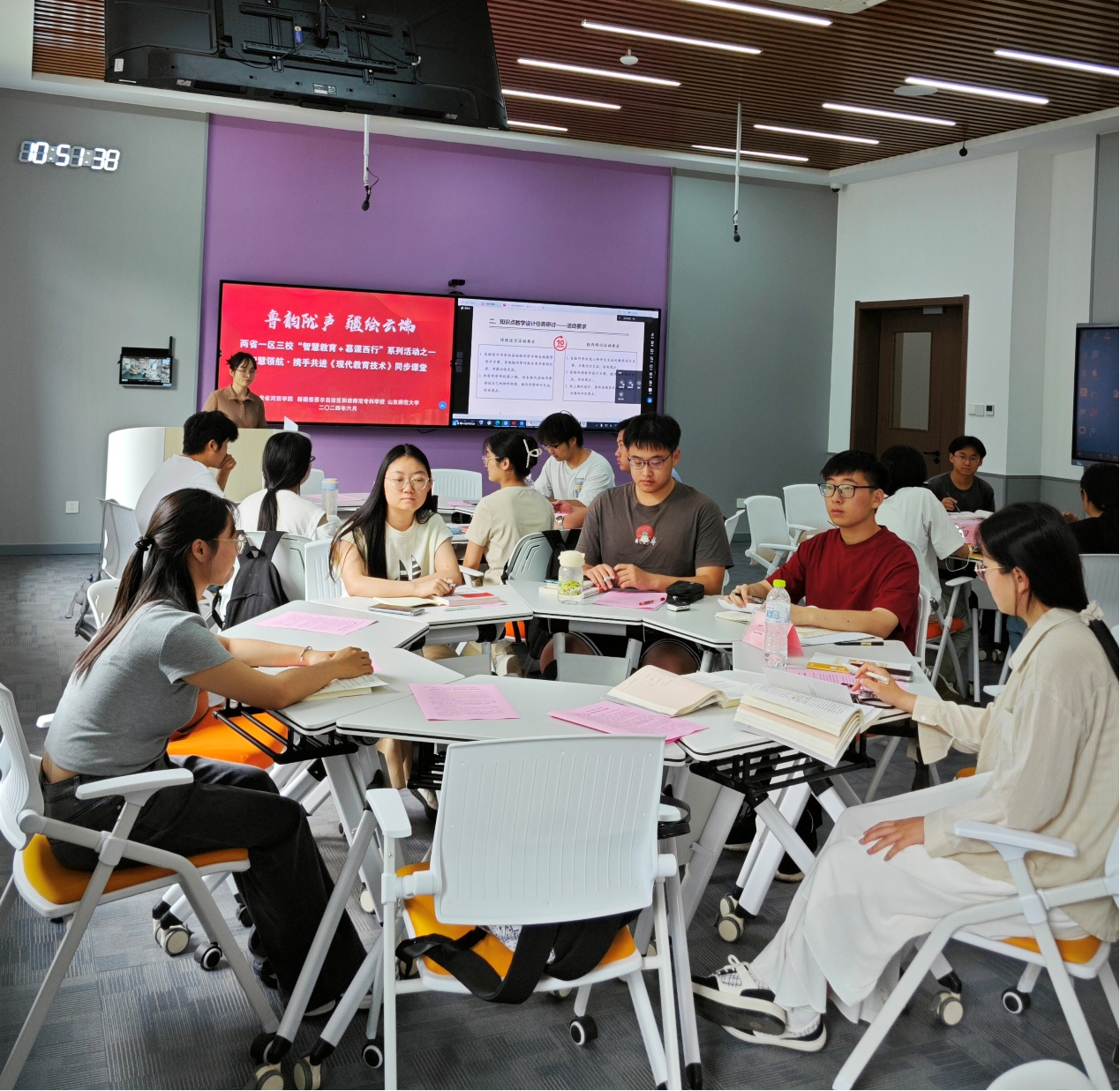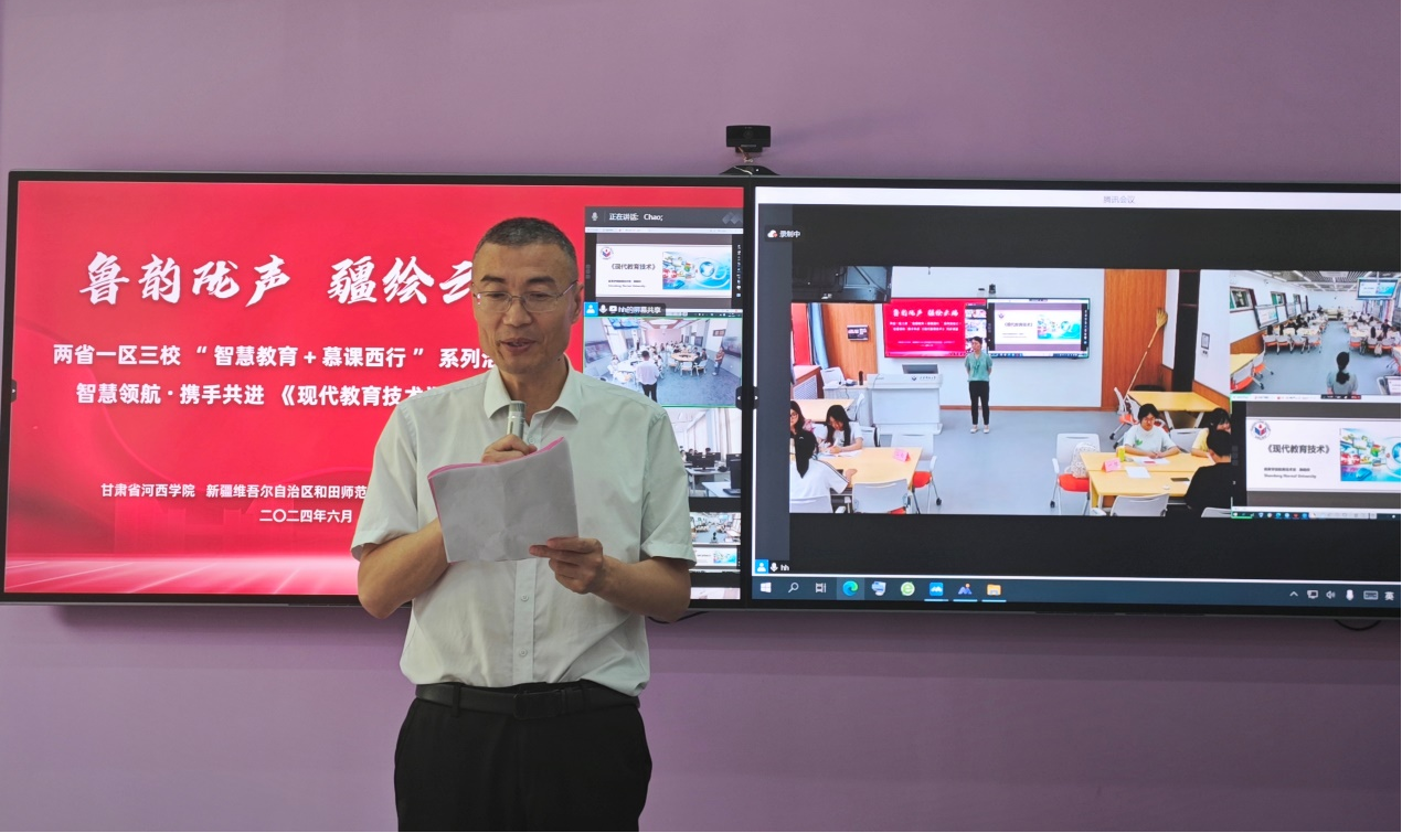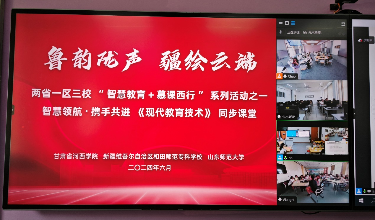 本次同步课堂开讲的课程《现代教育技术》是国家级一流课程、山东省课程思政示范课程,由学部教育技术系韩晓玲老师主授,河西学院的郭炳老师、和田师范专科学校的先木斯亚·买买提明老师以及学部教育技术系王超老师辅助,三校四地近百名学生在云端互联,同上一堂课。