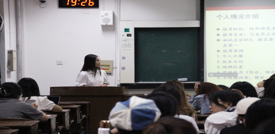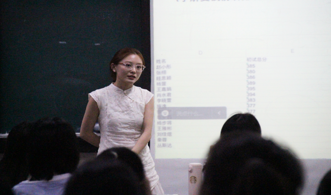 跨考是一条极具挑战性的道路。闵羽彤坚定步伐、踏实肯干,以笔试面试双第一的成绩上岸陕西师范大学马克思主义理论专业。会上她就专业介绍、公共课学习、备考经验等几个方面进行了分享,给正在纠结未来规划的师弟师妹们提供了一条新的选择之路。