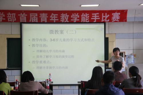 此次比赛由参赛老师现场抽取讲课主题,运用事先准备的课件进行十分钟的微课堂授课。比赛过程中,青年教师们结合自己执教的课程,采用讲授、案例、示范等方法,广泛运用图片、视频、音频等多种媒体,将自己专业研究与教学内容融为一体,开展了生动精彩的教学。老师们教学内容充实,条理清晰,逻辑严明,课堂节奏鲜明,在简短的微课中展示了学部青年教师的风采。