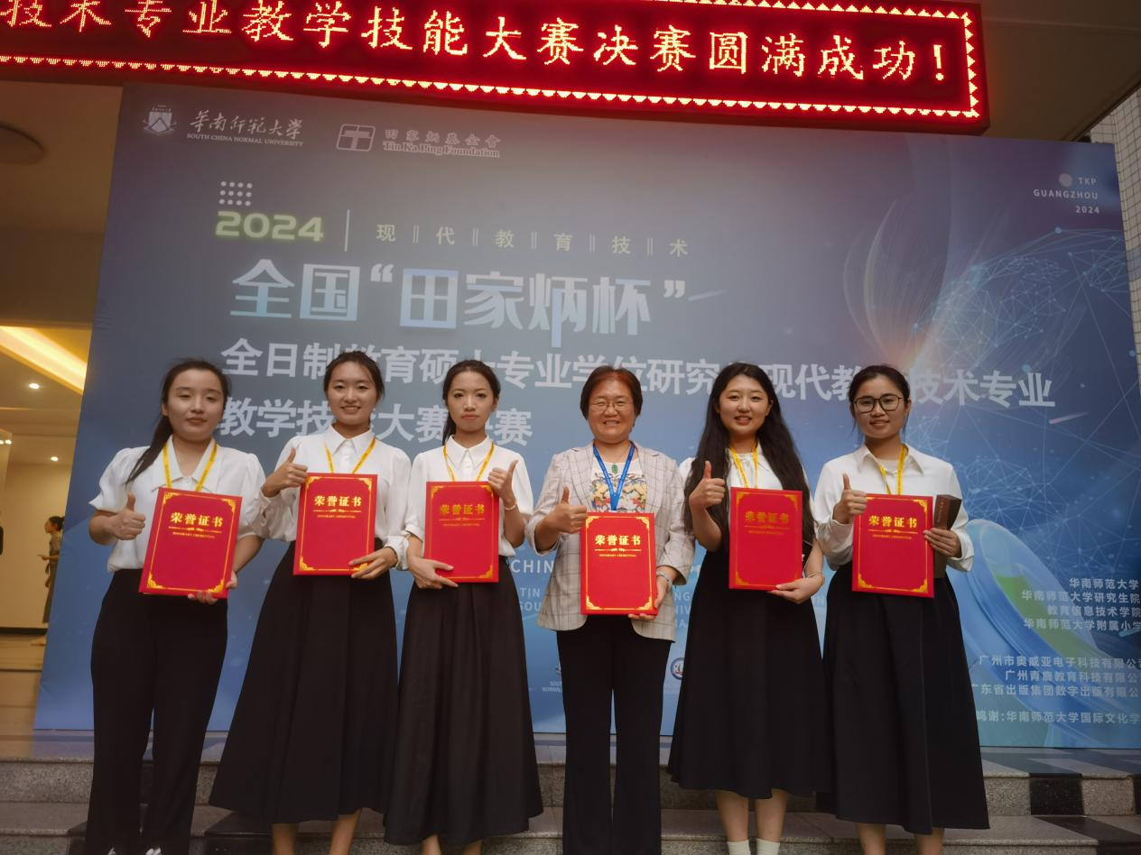 2024年11月8-10日,2024年全国“田家炳杯”全日制教育硕士专业学位研究生现代教育技术专业教学技能大赛决赛在美丽的花都广州举行。本届比赛是现代教育技术专业的第五届,由华南师范大学主办。比赛设初赛和决赛两个阶段,决赛分别按照10%、20%和40%设立一、二、三等奖。全国86 所高校的 396 名选⼿参加了初赛,经大赛组委会组织专家进行在线匿名评审,最终76所院校的201名选手入围决赛,我校现代教育技术专业的5名研究生全部闯入决赛。11月8日,学位点负责人、指导教师兼领队王春华教授带领5名同学赴羊城参赛,经过激烈角逐,最终获得了1个一等奖、4个三等奖,王春华教授获“优秀指导教师奖”,我校在该项赛事中再创佳绩!