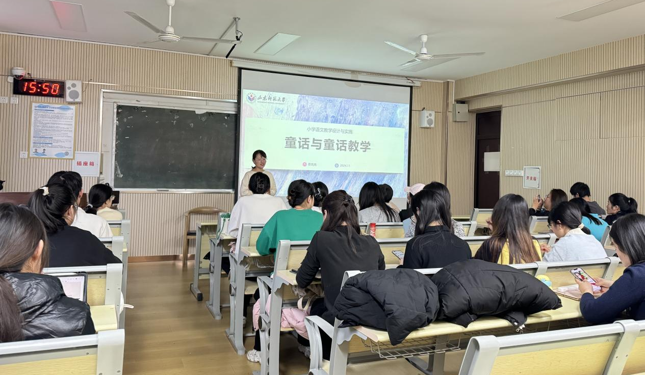 蔡亮亮老师是今年首开课教师,本次所讲课题是“童话与童话教学”。整堂课采用了启发式、互动式教学,综合运用了讲授法、提问法、案例分析法等教学方法,借助PPT呈现相关图片、文本和知识要点,环环相扣展开教学活动,帮助学生充分理解童话是什么、童话教学教什么等关键问题,课堂总体思路清晰、内容饱满,教师备课充分,内容熟悉,讲解较清楚明白,教态自然大方亲切,语言较流畅,师生互动较充分,学生参与度高,课堂气氛较活跃,教学效果良好。
