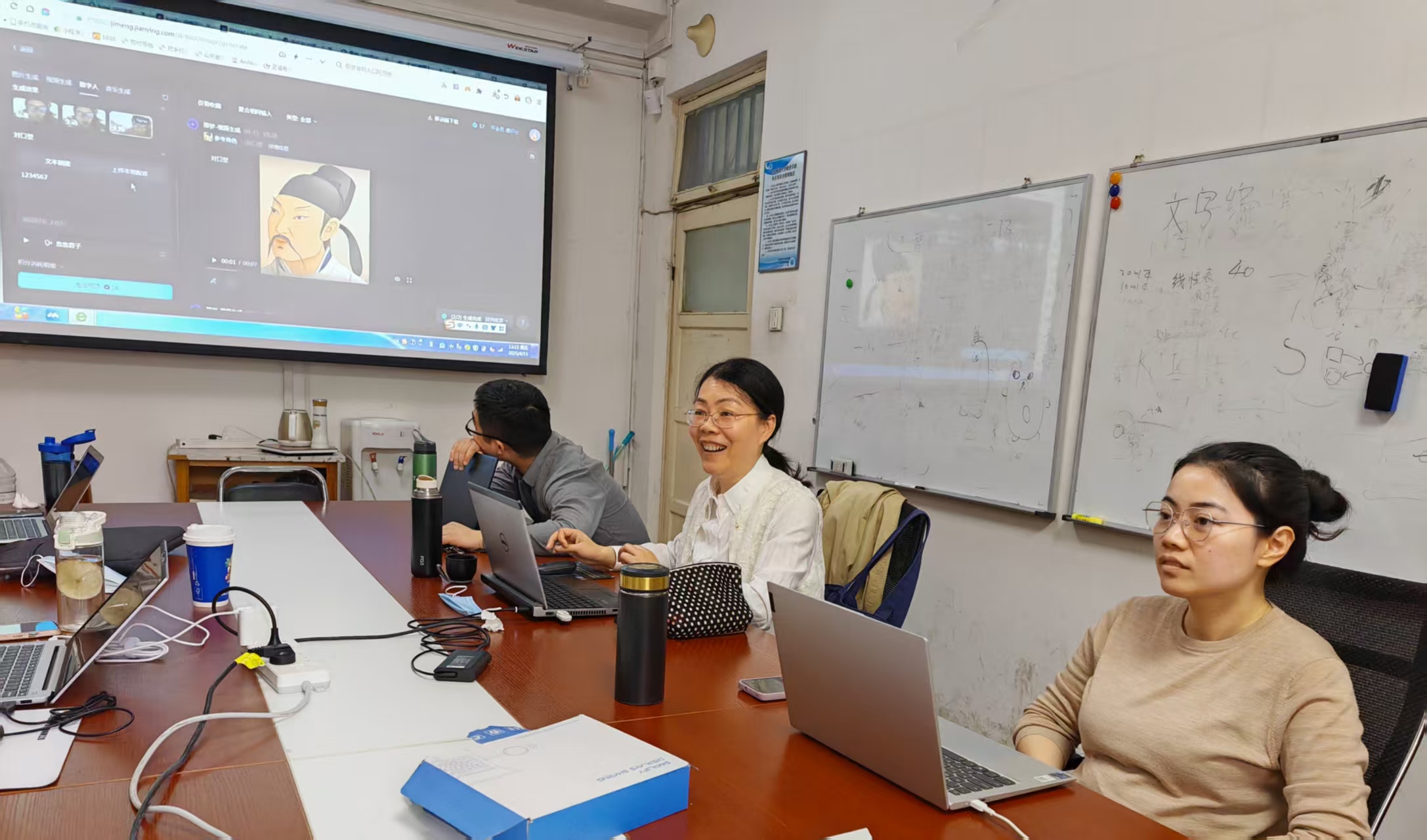 在完成线上课程的备课优化后,4月11日,现代教育技术教研室在4328教室开展AIGC(素材和资源生成)技能训练活动。活动伊始,韩晓玲老师介绍了几种常见的多模态大模型的功能,并借助DeepSeek、豆包、即梦AI、kimi、腾讯智影等工具,演示了资源(图像、思维导图、课件、视频)生成,数字人对口型与动作模拟,数字人微课等操作流程。为即将在"现代教育技术"课程中面向师范生讲授AIGC内容做好准备,研讨室的老师们针对上述AIGC内容开展了实践技能训练。最后,韩晓玲汇报了"现代教育技术"智慧课程的建设进展,同时部署了该课程后续的教学实施计划。