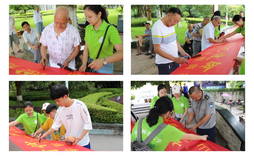 在实践活动中,队员们在向市民讲解交流了此次的活动目的、形式和意义后,市民们纷纷在“不忘初心步入新时代,牢记使命践行新思想”主题条幅上签上自己的名字,写下对实践活动的认可,与队员们积极分享40年广安的巨大变化,留下对祖国美好未来的寄语和畅想。随后团队成员与市民拍照留念。在签名活动中,最令队员们感动的是一名80多岁的老党员对观察团活动的肯定。老人家听闻活动后特意走上前详细询问,在条幅上写下了自己的名字和寄语,并向队员们详细讲述了自己关于改革开放的记忆,关于祖国的发展与变迁。同时,老党员勉励队员们说:“国家虽然富强了,但是仍然需要你们年轻人的努力。初心易得,但是却难坚守,希望你们能够真正做到‘不忘初心,牢记使命’!”