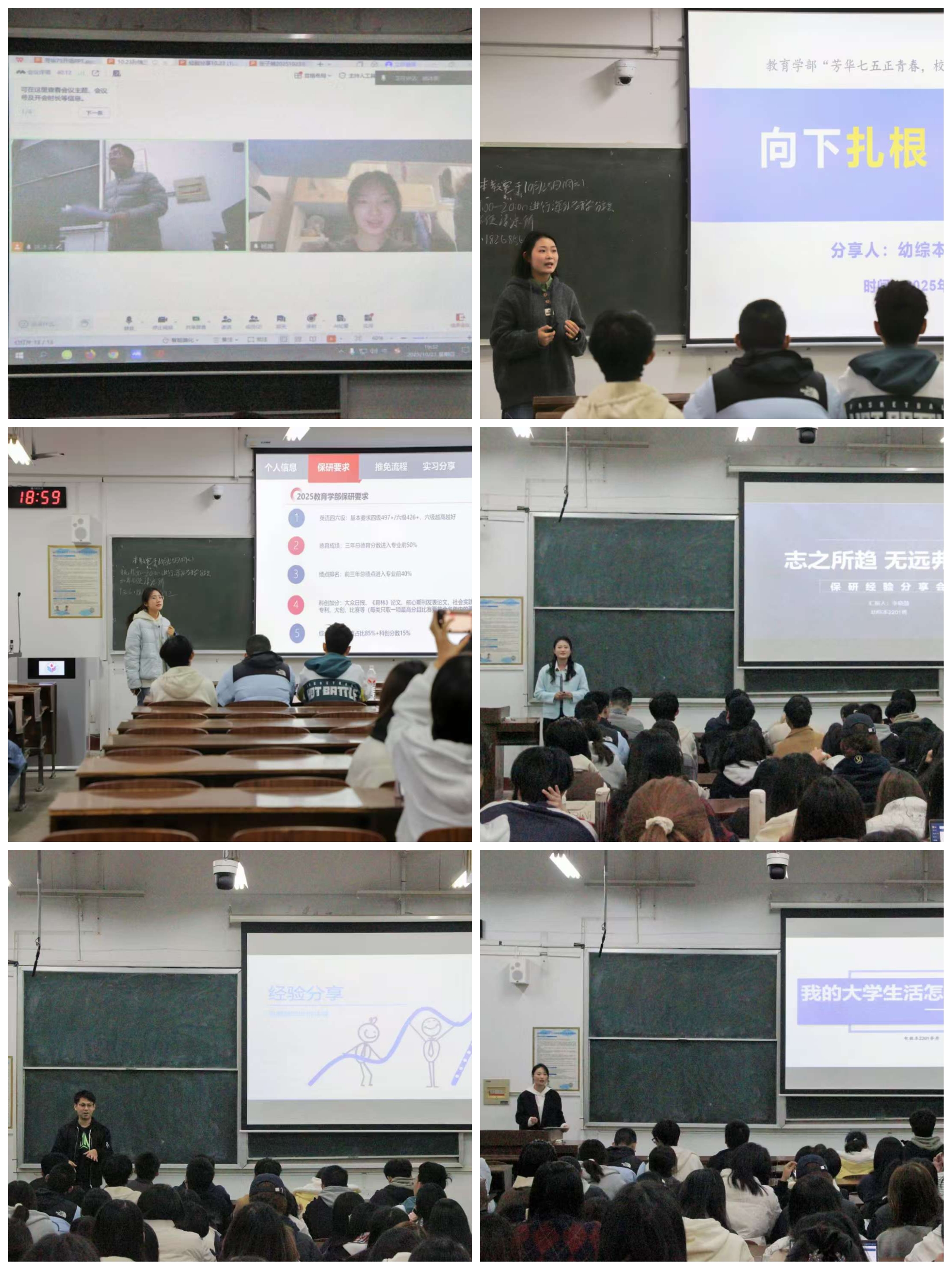 孙瑞玉分享结束后,杨媛通过远程连线,结合自己保研至清华大学的经历,分享了她在学习生活中的体会:在学习生活中应主动选择环境、积极把握机遇。她指出,人生犹如一场马拉松,某个节点固然重要,但并不能定义整个人生。“我们不应只追求一时的速度,而应关注整个旅程的广度与深度。”她还特别强调了学习的本质——学习不仅是为了应试,更重要的是理解、内化并应用知识,寄语同学们要脚踏实地,志存高远;幼教综2201的李晓慧以自身推免经验为例,从准备、投递简历、夏令营到面试阶段,向同学们全方位展示了保研流程,并就如何安排保研提出了独到的建议;电教综2201的宿佳诚向同学们介绍了大学四年的学习生活路径,以其简洁朴实的语言与真挚的情感,向同学们说明了大学期间可能面临的问题与挑战,并分享了自己的应对策略;电教本2201的李丹向大家展现了一份长期规划。她着重介绍了有关专业课程、考试考证、创新创业和社会实践等方面的内容,并强调良好心态在学习和生活中的重要作用;教育本2201的王慧向同学们详细介绍了保研推免的具体流程,并结合自身经验提出了对于保研推免的独特见解。同时,她还结合自身实习情况,全面地向同学讲解了有关大三下半学期实习的相关事项,解答了许多同学关于实习方面的疑惑;幼综本2201的张子晴围绕保研推免问题与日常的学习方法展开了分享。在有关学习方面提出了一系列心得,指出“行动是打败焦虑的最好方法”,帮助同学们减缓焦虑心理,轻松投入学习。
