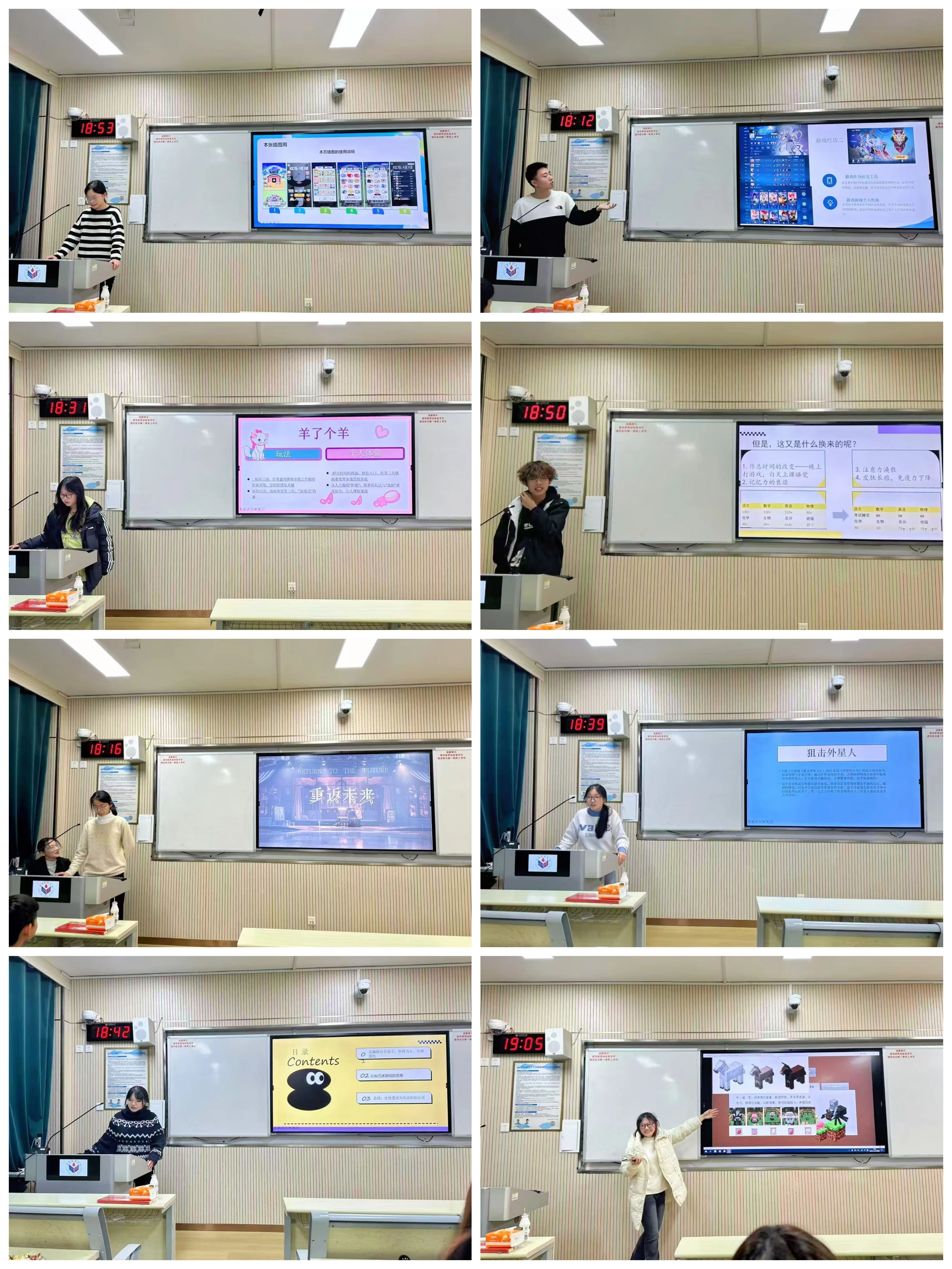 活动第一阶段是游戏分享。各小组代表依次上台,借助精心制作的PPT,以图文并茂、生动形象的方式,向在场师生展示了《王者荣耀》《我的世界》《狙击外星人》等多款具有广泛影响力与代表性的电子游戏。同学们的分享并未停留在简单的游戏介绍或趣味体验层面,而是深入挖掘游戏背后的教育意涵。他们结合自身游戏经历,不仅真诚分享了游戏带来的乐趣、挑战与成就感,更从情绪调节、团队协作、创新激励、逻辑思维训练乃至文化审美熏陶等多个维度,深入探讨了游戏对个体成长与日常生活的积极影响。通过引证实例、剖析机制,同学们展现出对游戏价值多元、立体且富有深度的理解,打破了以往对游戏“玩物丧志”的单一刻板印象。与此同时,也有同学从切身体验出发,真诚剖析了游戏可能带来的双重影响,为合理使用游戏指明了方向。