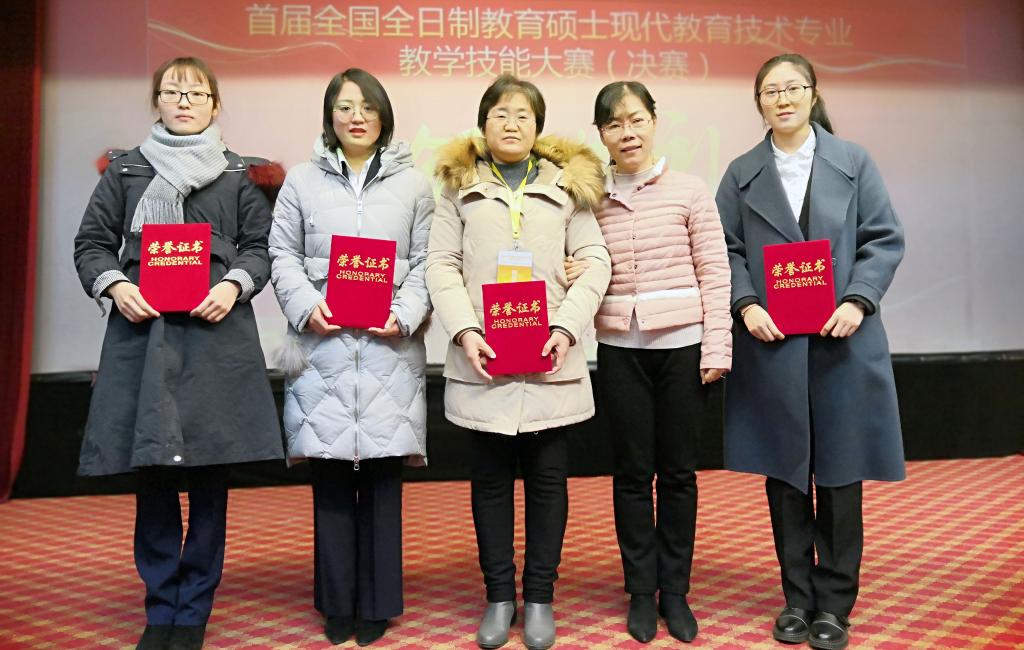 12月7日至9日,由全国教育专业学位研究生教育指导委员会主办、江苏师范大学承办的首届全国全日制教育硕士现代教育技术专业教学技能大赛(决赛)在江苏徐州成功举办。我校英国上市公司365现代教育技术专业的5名学生在比赛中表现优异,发挥出色,取得了辉煌战绩。其中,杜春梅同学荣获全国一等奖,修玉蕾、方泽同学荣获全国二等奖,一、二等奖获奖人数在所有参赛高校中并列第一,同时也是我校各专业教育硕士参加同类大赛的最好成绩。王春华、韩晓玲、杨晓娟三位指导教师均荣获优秀指导教师奖。本次比赛,由王春华教授担任领队,与韩晓玲副教授、杨晓娟副教授组成指导教师团队,共同带队参赛。