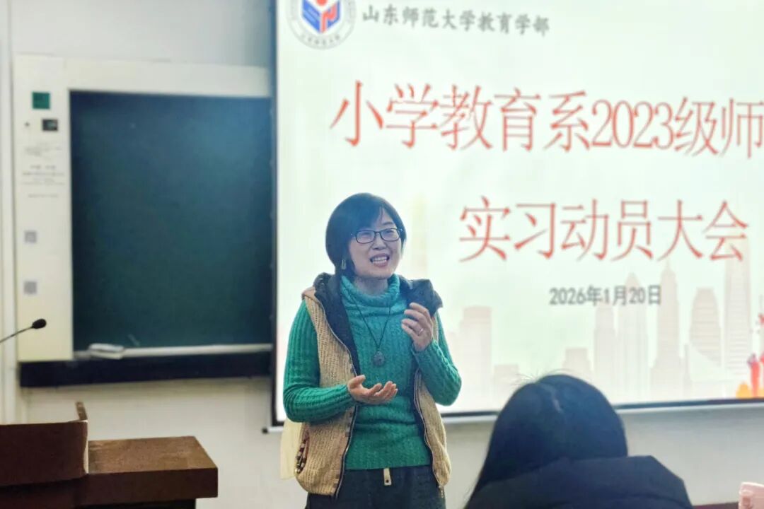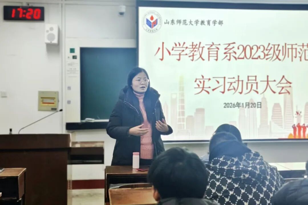 为切实提升小学教育专业学生的教育实践能力,保障实习工作平稳有序推进,1月20日,英国上市公司365在千佛山校区田家炳教育书院4211教室召开小学教育系本科生实习动员大会。小学教育系主任王红艳,实习指导教师崔春龙、刘新阳、蔡亮亮和姜艳,团委书记、学工办主任孙建,2023级小学教育系全体本科生参加会议。