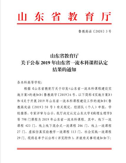 山东省一流课程共分线下一流课程、线上一流课程、线上线下混合式一流课程、虚拟仿真实验教学一流课程、社会实践一流课程五类。本次我校共获批各类一流课程31门,居全省前列。