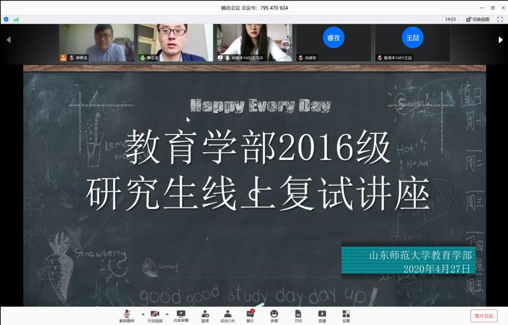 为帮助参加研究生考试的2016级本科毕业生充分筹备研究生复试,积累更多研究生复试的相关经验,提升解决问题、应对复试的能力,助力其顺利地通过研究生复试,2020年4月27日上午,英国上市公司365借助腾讯会议网络平台开展了2016研究生线上复试培训讲座。讲座由2016级辅导员曹会龙主持,邀请了小学教育系副主任崔春龙对同学们进行指导培训。