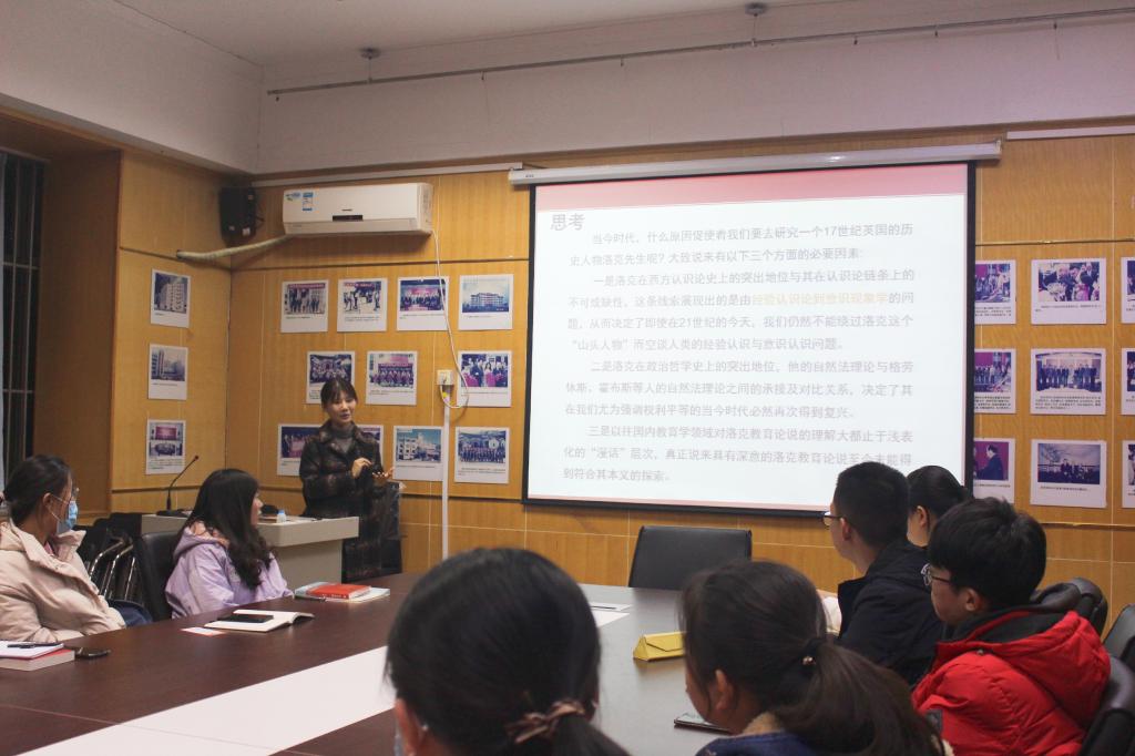 交流会上,赵书琪结合当前同学们的阅读现状,从“何谓教学名著”、“中外名著推荐”、“名著导读”、“读书方法例举”四个方面,阐述了在校学生应该读哪些教育名著以及如何读好教育名著这一问题。赵书琪谈到,教育名著是指在历史和当代有着广泛影响的研究教育的专著,在不同时期东西方都有各自的代表性教育名著。阅读教育名著时,可以采用以下四种方法:即“读书即对话”,读一本书就是在与一位伟大的思想家对话;“读书望悬置”,要停止判断,避免自己的经验对阅读造成妨碍;“读书要动笔”,在阅读的过程中心得随记,避免遗忘;“读书需分享”,要形成一个“读书共同体”,互相交流,加深理解,开阔思想。随后,她以本期书目《教育漫话》为例介绍了作者约翰·洛克的历史背景,作为十七世纪欧洲资产阶级唯物论代表人物,洛克始终秉持着“经验主义”哲学思想与“白板说”教育思想,并由此引出了世界哲学历史的三个阶段,为同学们接下来的自主阅读做了铺垫和引导。