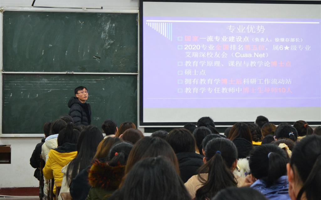 随后,三个专业的负责人对各专业情况进行了详细的介绍。陈大兴老师首先从我校教育学专业的优势和我校教育学专业的人才培养体系两个维度肯定了我校教育学专业的办学水平,其次以“教育学要学什么和它的培养目标是什么”两个核心问题逐层展开,让同学们了解了专业的课程结构、修读学分要求和教学计划安排,并突出了理论与研训相结合的自主发展课程的亮点。不论是对学生自主学习能力的新要求,亦或是本专业保研考研升学成果的展示,都激发了同学们对教育学专业的学习与研究兴趣。