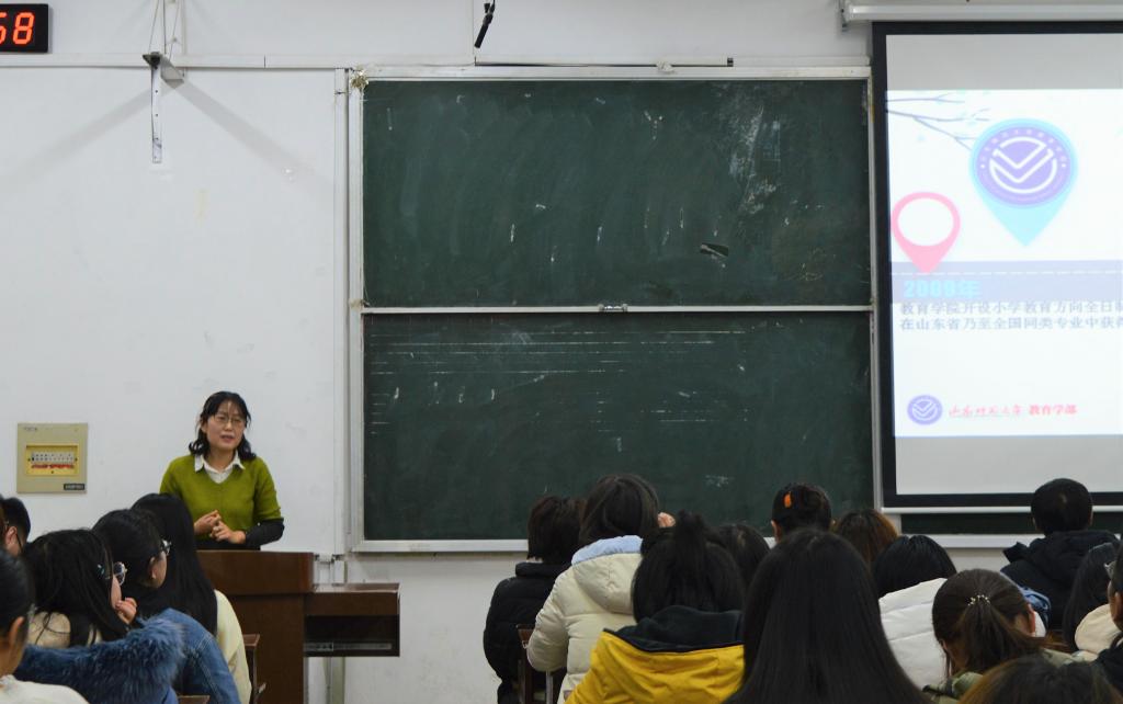 王红艳老师将小学活泼灵动的特点寓于宣讲之中,从小学教育专业成立的背景、培养目标与前景、课程设置与师资、小教专业特色四个方面阐述了本专业发展现状和培养预期,通过2019级学长们的亲身感悟与照片记录播放的形式突出强调了小教系的导师制、课堂现场、实践教学等特色,培养具有终身学习发展意识和齐鲁文化视野的高素质小学教师的观念深入人心。一段展现2019级大类分流到小教的学长们亲身体验的视频,更是以生动幽默的方式缓解了同学们心中的紧张,解答了心中的困惑,同学们对小教的发展信心满满。