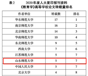 2020年度人大复印资料《教育学》刊文数据显示,文章第一作者所属单位以师范院校为主。华东师范大学位居榜首,南京师范大学列第二,北京师范大学列第三。学部老师为第一作者的论文共5篇,排名全国高校第七。