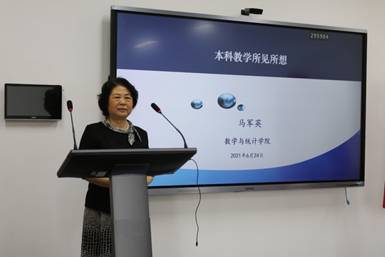 马军英教授结合自己多年担任学校教学督导组成员的经历和感受,从所见和所想两个角度畅谈了自己对如何提高本科教学质量、提高教师教学能力的看法和建议。马老师指出,在本科教学督导过程中,她看到近些年来老师们对教学的认真投入、青年教师的可喜成长,以及教学中存在的教学内容选取欠合理、教学过程安排欠适宜、教学手段使用欠有效、教学语言教态欠恰当等问题,为在座教师提供了反思的视角。同时,马老师对如何提升教师教学能力向学部和青年教师分别提出了具体可行的建议。她指出,学院(部)应重视青年教师教学能力的培养,通过建立传帮带机制、开展备课组教评活动、举办教学研究讲座等举措,帮助青年教师成长。青年教师也要努力做到明确课程的教学理念、合理设置教学环节、引导学生深度思考、增强课堂视听效果、拓展提升课程知识,自觉主动地加强教育教学的探索和实践,提升教学质量。最后,马老师对青年教师提出了一辈子当老师,一辈子学当好老师的殷切希望。