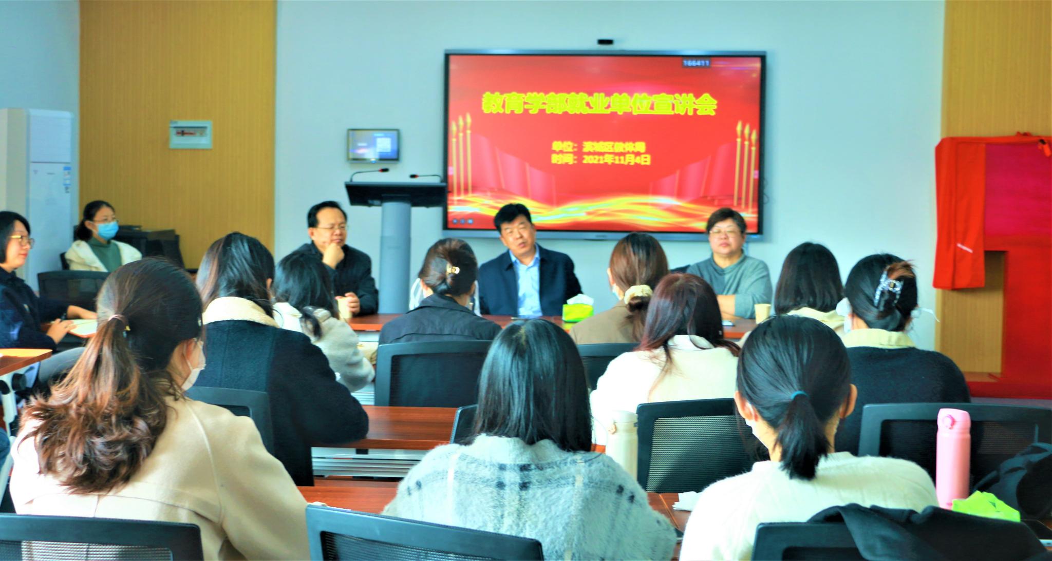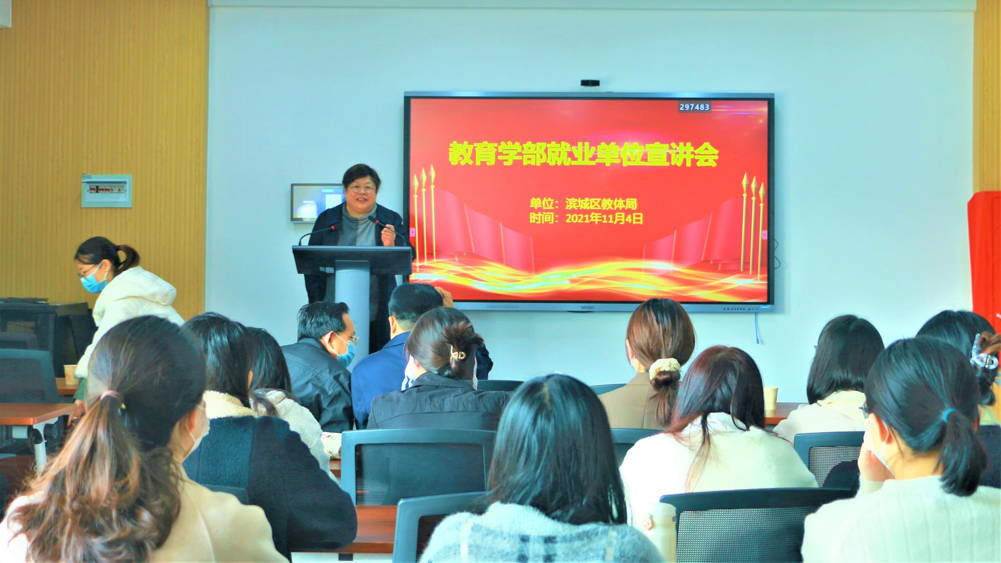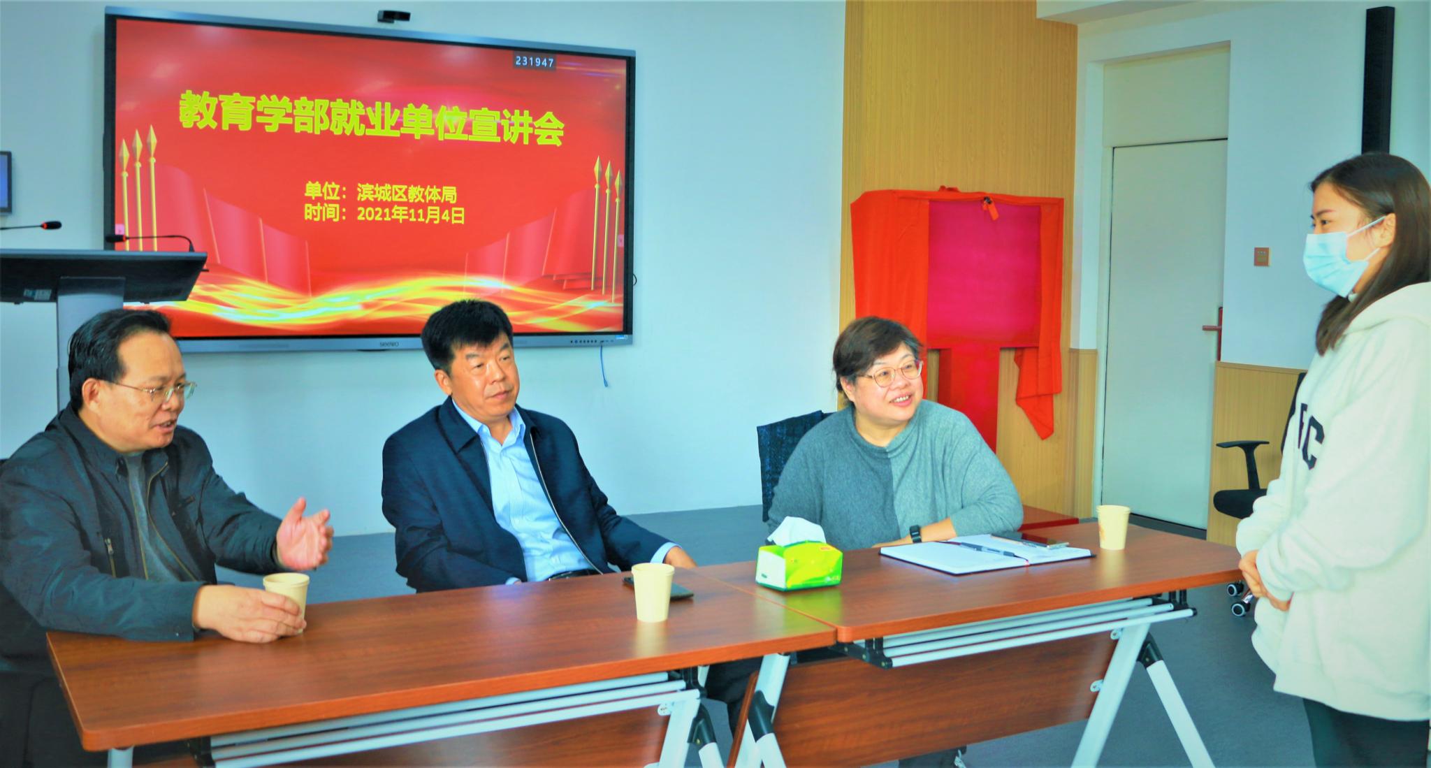 会议伊始,刘永慧副书记代表教育学部对滨城区教体局人员的到来表示了热烈的欢迎。滨城区教体局表达了对我校师范教育的认可和希望招聘到优秀毕业生的诚意,介绍了滨城区的学校情况、师资情况和政策要求。韩新民局长表示,此次赴英国上市公司365宣讲的目的是为了能从我校招聘高素质、高水平人才,为优秀毕业生提供良好的就业平台,切实做好滨城区2022年校园招聘工作,有效提升区域教师队伍素质和水平。