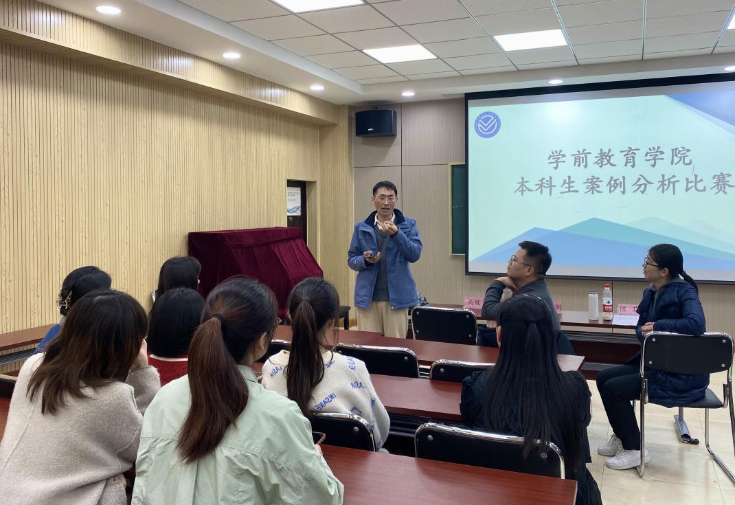 案例分析包括抽题、准备与作答三个环节。参赛学生沉着冷静,在规定时间内组织与呈现答案,思维碰撞的火花充斥在赛场的每个角落。从视频材料分析“爱的抱抱”到文字材料分析“阅读区搭建”,同学们紧密围绕每个案例的问题视角,结合相关专业理论知识,有针对性地通过枚举材料中的关键点来支持自己的分析结论,彰显了科学的儿童观和教育观,体现了运用理论知识分析和说明实践案例的能力。比赛结束后,高健老师肯定了参赛学生的基础理论素养。他认为案例分析是一种综合应用能力的考察,本身难度系数较高,令人惊喜的是参赛的同学们展示出了对基础理论知识的深度理解和把握。