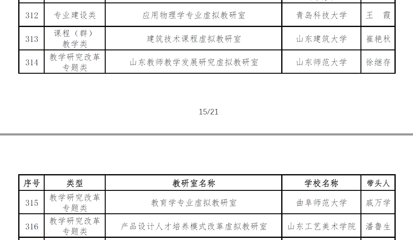 首批虚拟教研室建设试点工作于2021年7月启动,经各地各高校和教育部高等学校教学指导委员会推荐、专家综合评议,最终确定了首批虚拟教研室建设试点共计439个,山东省属高校获批5项。从建设内容划分为课程(群)教学类、专业建设类、教学研究改革专题类3种类型,“山东教师教学发展研究虚拟教研室”属于教学研究改革专题类试点项目,旨在锻造一支高水平教学团队,培育一批教学研究与实践成果,提高我省教师教育师资水平。