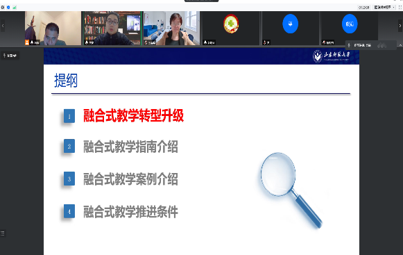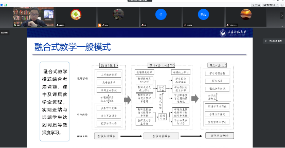 研讨开始,技术教研室主任吴磊博士首先进行以“融合式教学实施与案例”为主题的报告。整个报告分融合式教学转型升级、融合式教学指南介绍、融合式教学案例介绍、融合式教学推进条件四个部分,通过多维度展示,向参会教师全面介绍了融合式教学内涵、实施步骤、应用场景及可行性条件。