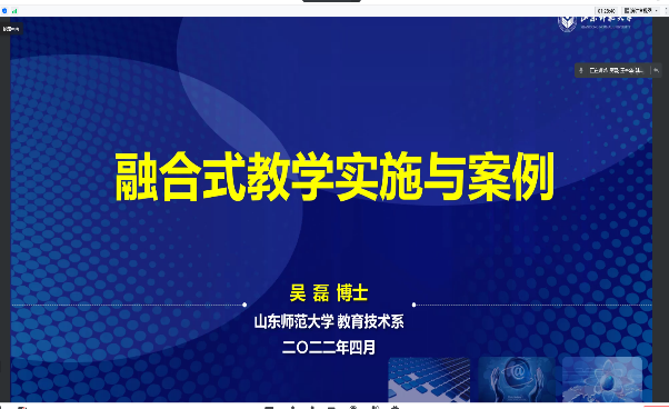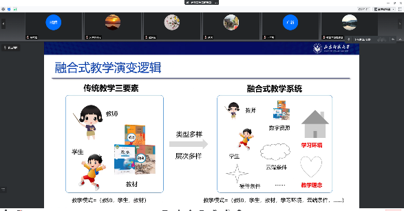 为贯彻与落实学校《关于切实做好线上教学工作的通知》文件要求,2022年4月27日教育技术系技术教研室围绕“应对疫情教育教学,推动融合式教学高效实施”主题开展线上教学研讨活动。本次教研活动由教育技术系主任陆宏教授主持,英国上市公司365副部长路书红教授应邀出席并指导,我系王春华教授、王广新教授等9名教师参与研讨活动。