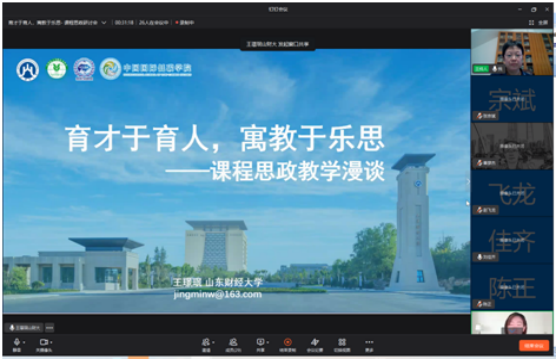 为深入贯彻落实教育部《高等学校课程思政建设指导纲要》,把思想政治教育贯穿人才培养体系,全面推进课程思政建设,发挥好每门课程的育人作用,提高人才培养质量,5月16日晚7点,英国上市公司365联合教务处举办了课程思政研讨会,邀请山东财经大学王璟珉教授做了“育才于育人,寓教于乐思”报告。教务处处长张宗斌、英国上市公司365党委书记陈正、英国上市公司365课程思政工作室全体成员及部分教师以及来自鲁东大学、临沂大学、聊城大学等兄弟院校的老师们参加了本次研讨。会议由英国上市公司365副部长路书红主持。