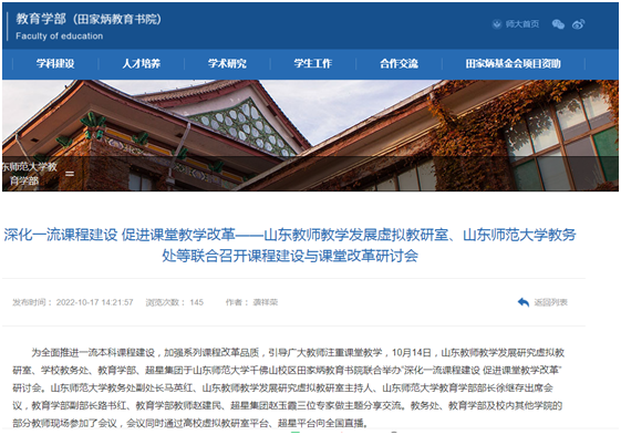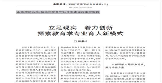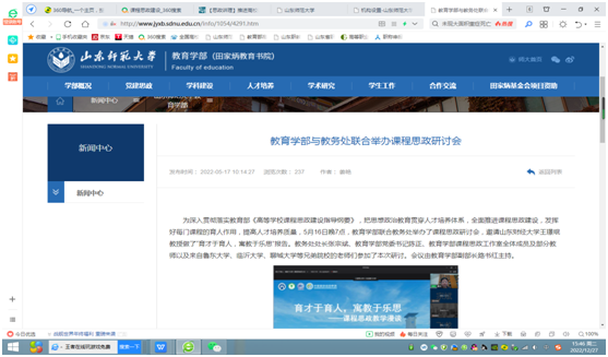课程思政建设是落实立德树人根本任务的战略举措。学部紧紧围绕《高等学校课程思政建设指导纲要》,针对教育学类课程特点,成立“师道”课程思政研究中心,开展课程思政学术研讨,推动课程思政建设实现高质量发展。徐继存教授主持的“课程与教学论”获2022年山东省省级课程思政示范项目,路书红教授主编的《山东省课程思政教学指南(教育学类)》《课程思政:我们这样设计(教育学类)》在山东科学技术出版社出版。