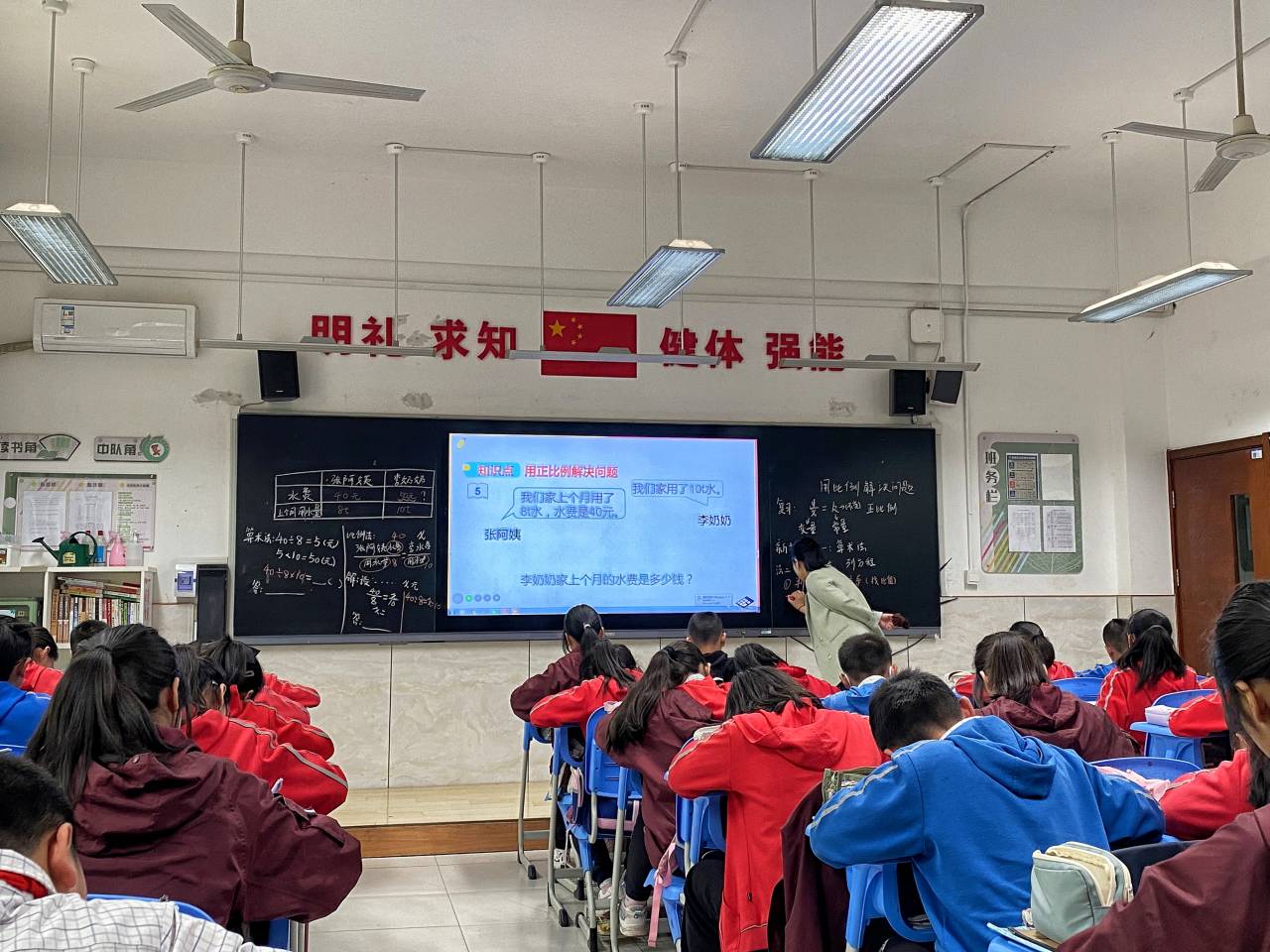 《用正比例解决问题》是人教版小学数学六年级下册第四单元“比例”中的一个重要学习内容,研究生们怀着期待的心情和小学生一起进入本节课的学习中。赵艺老师基于学生已有的知识基础有序地开展本节课的学习,首先通过复习正比例的关系式导入,接着在情境化的问题中带领学生探究不同的解题方法,最后在学生完成练习后梳理总结比例法的解题步骤。相较于初中紧凑的课堂节奏,小学课堂中更注重学生对知识的理解与掌握情况,老师在新授过程中,围绕一种题型反复变式练习,让学生获得对于算术法、比例法的感悟。在授课中,赵老师还充分有效地利用黑板的空间,分片书写,左侧呈现解题的步骤,右侧呈现本节课的教学过程,并用红色的粉笔点明本节课的重点。除此之外,老师在课堂教学过程中渗透学习习惯的培养,如带着大家勾画题目,归纳其中的等量关系;提醒学生用分栏的书写形式,保证卷面的整洁等,让学生在潜移默化中形成良好的学习习惯。对比小学与初中不同的教学方式、学习方式,小教的同学们也陷入了沉思——今后自己应该让学生带着些什么走入到初中的数学课堂。